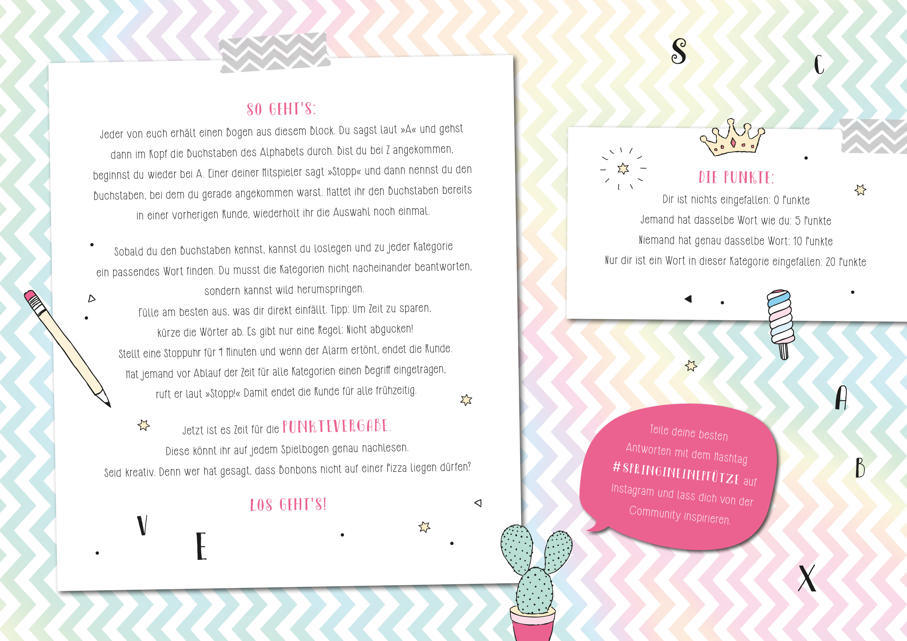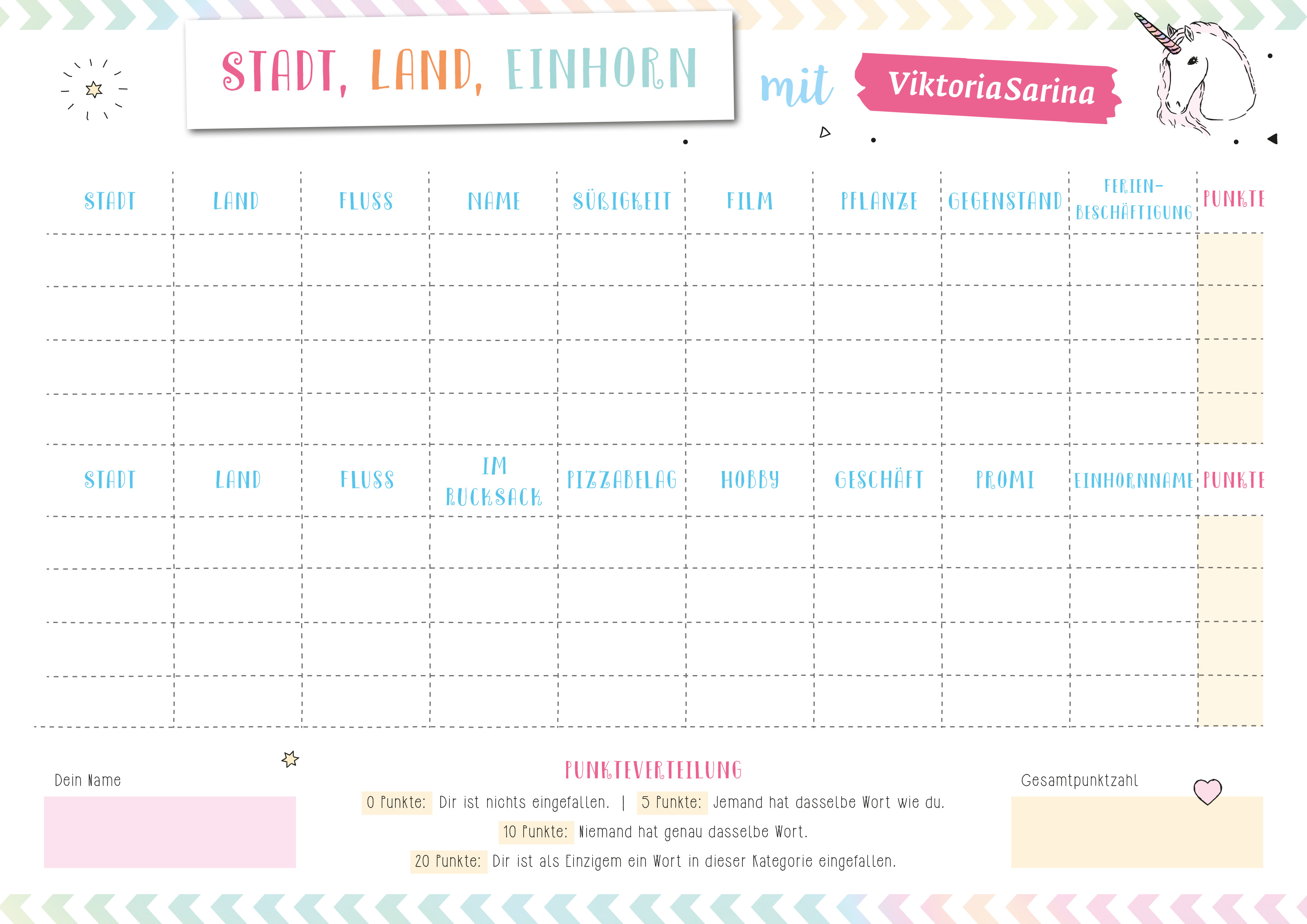 Mit Stadt Land Einhorn bringen die besten Freundinnen und YouTuberinnen Viktoria und Sarina den Spieleklassiker "Stadt, Land, Fluss" mit neuen Ideen zu dir nach Hause! Das Besondere an ihrem Spieleblock mit 50 Seiten? Viktoria und Sarina haben sich lustige und kreative Kategorien einfallen lassen: Du findest neben den Klassikern "Stadt", "Land" und "Fluss" lustige Kategorien wie "Ausrede", "Pizzabelag" und viele mehr. Zusätzlich kannst du auf 10 Seiten selbst kreativ werden: Denk dir deine ganz eigenen Kategorien aus - je verrückter, desto besser!