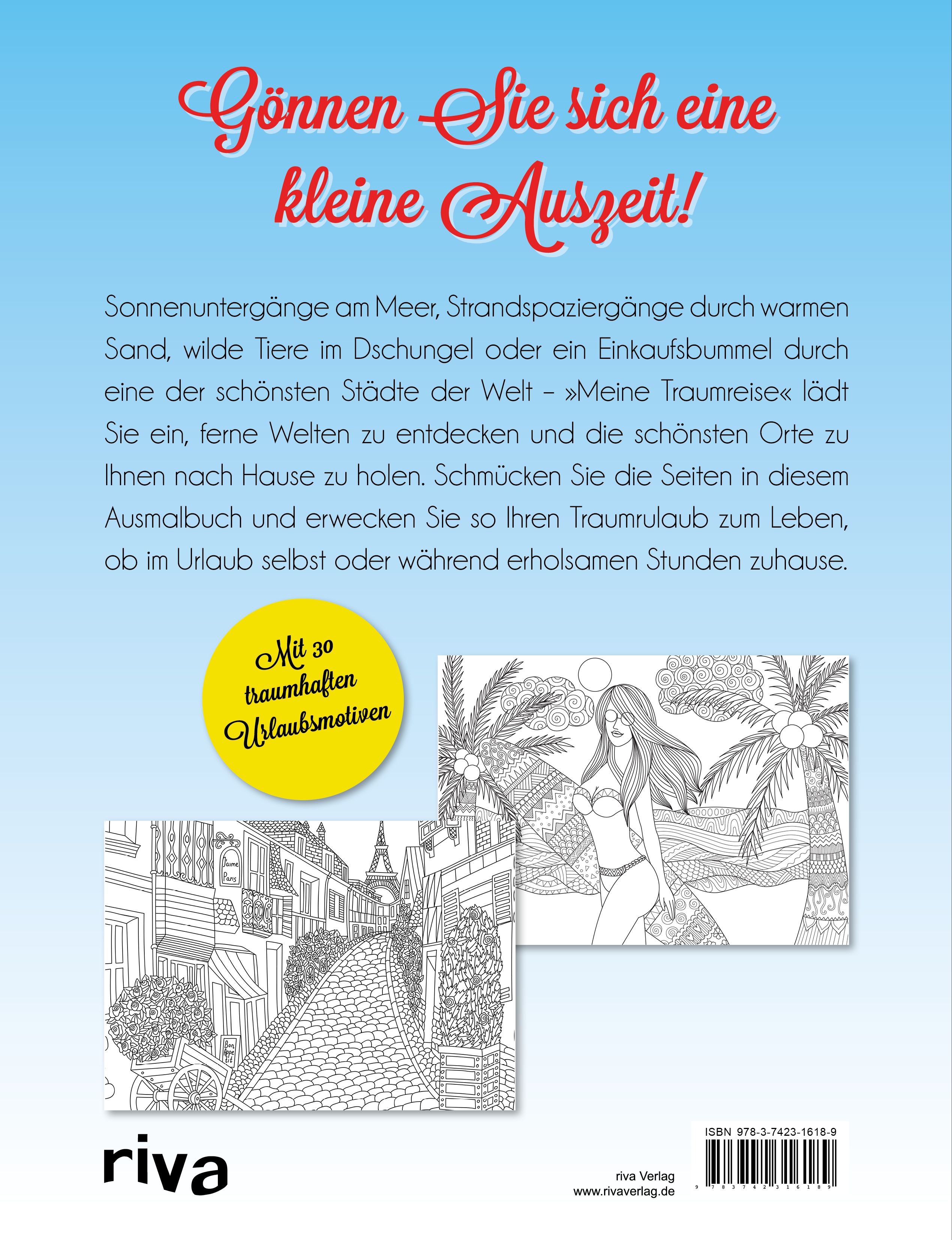 Sonnenuntergänge am Meer, Strandspaziergänge durch warmen Sand, wilde Tiere im Dschungel oder ein Einkaufsbummel durch eine der schönsten Städte der Welt Meine Traumreise lädt Sie ein, ferne Welten zu entdecken und die schönsten Orte zu sich nach Hause zu holen. Schmücken Sie die Seiten in diesem Ausmalbuch und erwecken Sie so Ihren Traumurlaub zum Leben, ob im Urlaub selbst oder während erholsamer Stunden zu Hause.