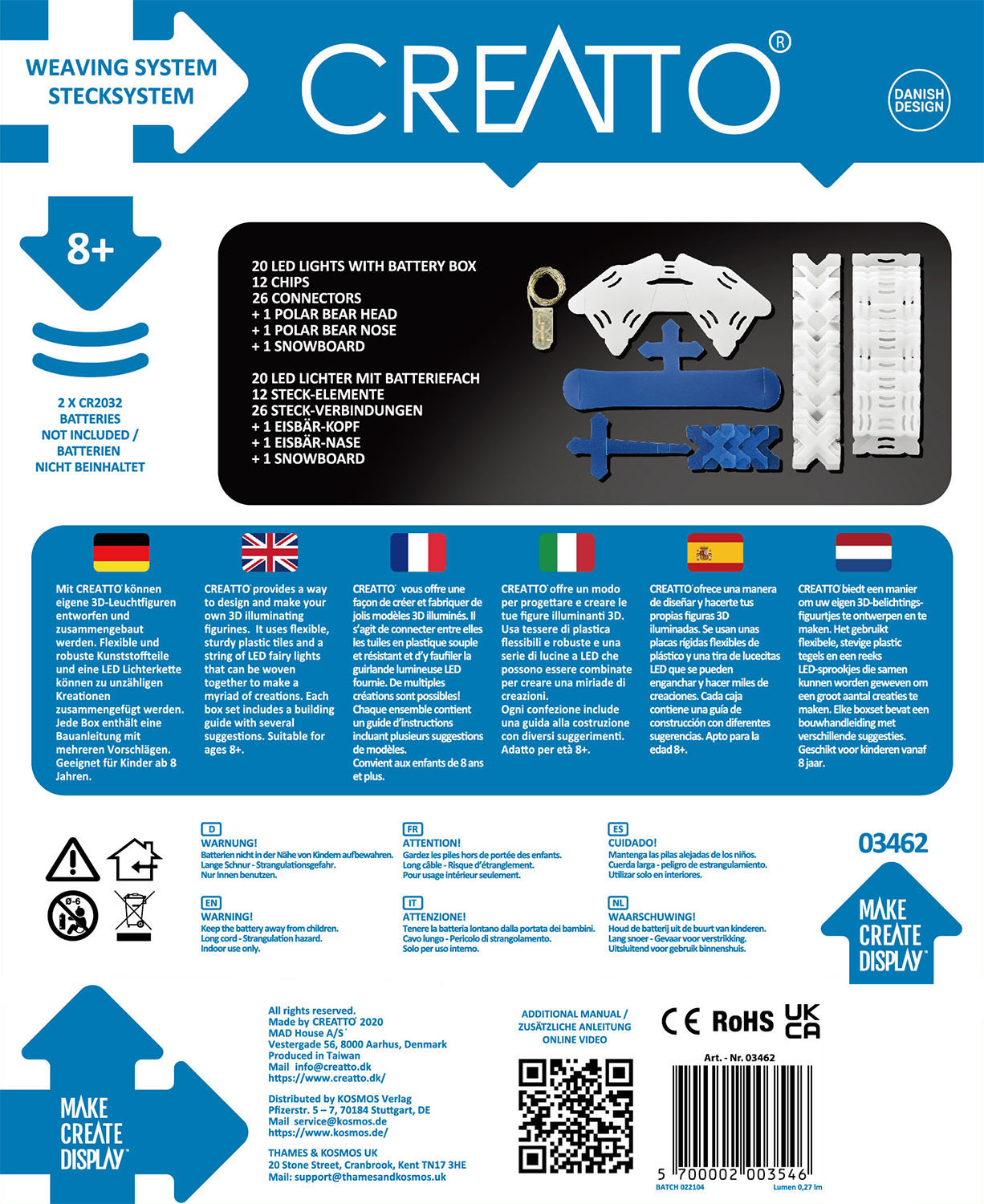 Süßer LED-Eisbär zum Selberbauen. Wie niedlich! Mit dem 3D-Puzzle-Set „Polar“ bauen Kinder ab 8 Jahren leuchtende 3D-Modelle. Und wandelbar sind sie auch noch! Ein paar kleine Änderungen, und ein Eisbär wird zu einem Snowboard-Bär oder zu einer Schneeflocke oder einer Baby-Robbe. Wer etwas ganz Neues bauen möchte, lässt seiner Kreativität einfach freien Lauf. Noch die LED-Lichterkette im Inneren befestigen – fertig ist die besondere Lampe. Wie das geht? Einfach dem Video-Tutorial oder der gedruckten Anleitung folgen. Ein spannendes DIY-Projekt als Deko fürs Kinderzimmer!