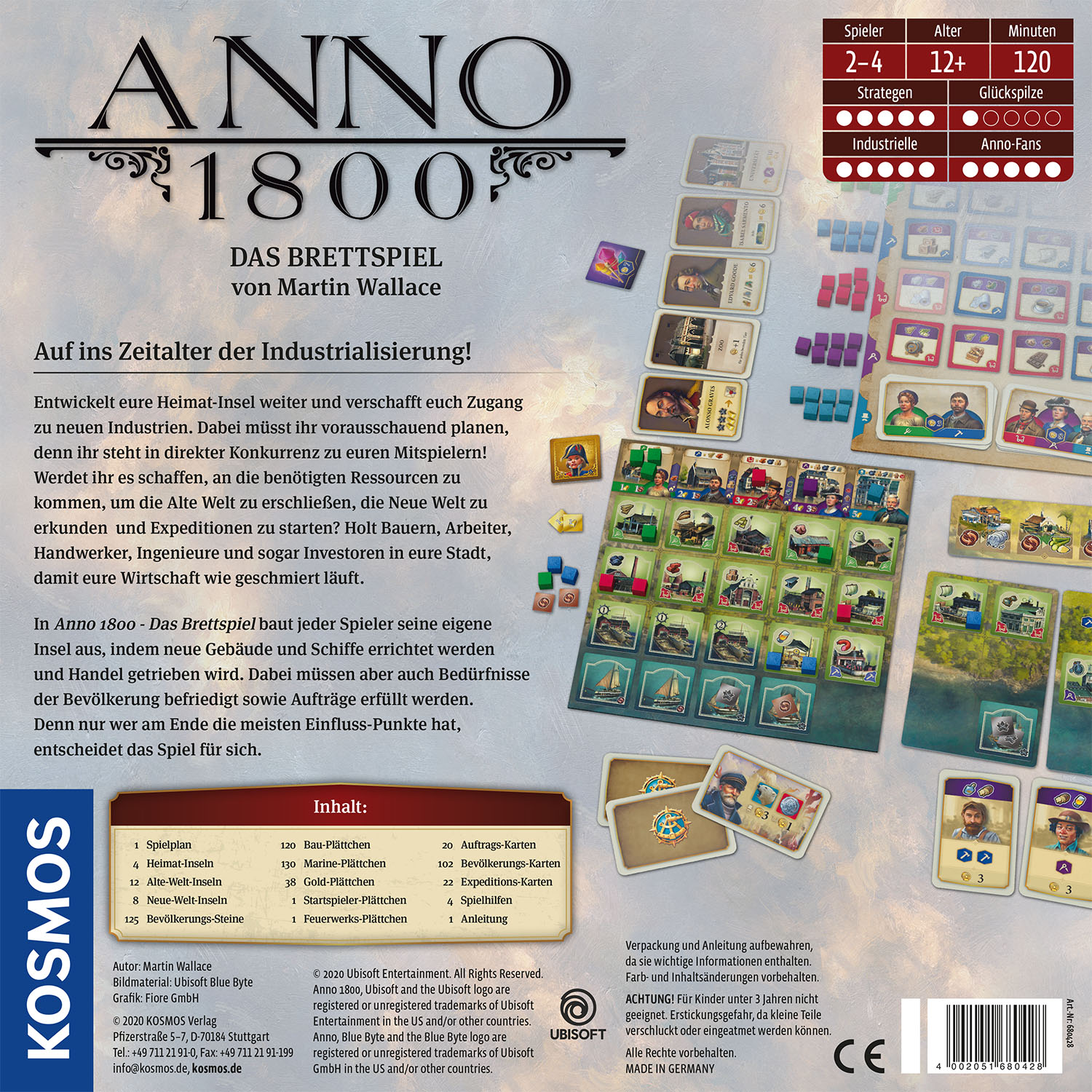 Das erfolgreiche PC-Spiel "Anno 1800" jetzt als Brettspiel offline erleben. Vom weltweiten Erfolgsautor für anspruchsvolle Strategiespiele Martin Wallace. Kurze Spielzüge und besonderer Handelsmechanismus. Mit atmosphärischen Originalgrafiken aus dem erfolgreiche PC Spiel. Strategiespiel ab 12 Jahren für 2-4 Spieler.Die Industrialisierung hat begonnen! Im großen Aufbau-Strategie-Spiel baut jeder Spieler kontinuierlich die eigene Industrie auf, um seine Heimatinsel weiterzuentwickeln. Schiffsflotten ermöglichen einen regen Handel und die Erschließung neuer Inseln in der Alten und Neuen Welt. Es gilt in dieser analogen Umsetzung des PC-Spiels die Wünsche der eigenen Bevölkerung zu erfüllen. Sind die Einwohner anfangs noch mit Brot und Kleidung zufrieden, verlangen sie schon bald nach wertvollen Luxusgütern. Dabei müssen die Spieler bei diesem Gesellschaftsspiel ihre Produktionsketten sinnvoll planen und die Spezialisierung ihrer Bevölkerung im Auge behalten. Kommt es doch darauf an, eine kluge Verteilung von Bauern, Arbeitern, Handwerkern, Ingenieuren und Investoren zu erreichen. Aber Vorsicht: die Konkurrenz schläft nicht und könnte die neuen Errungenschaften jederzeit vor der Nase wegschnappen! Wer erschafft die florierendste Insel?