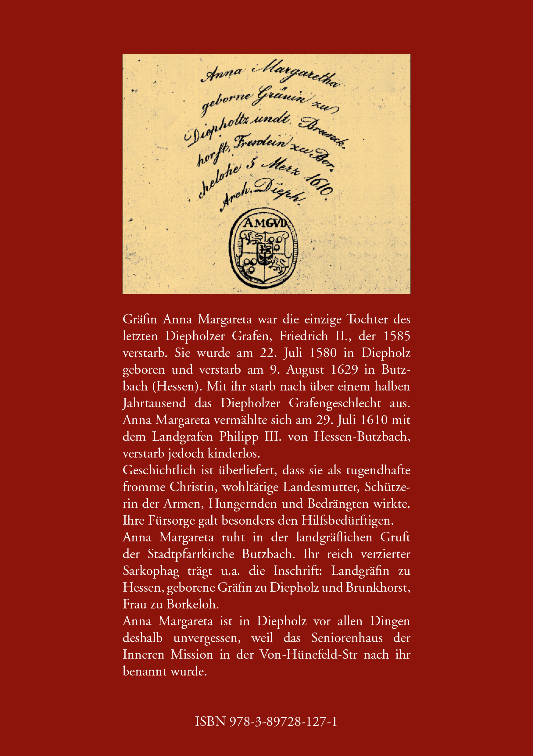 EIN GESCHLECHT GEHT AB DAS ANDER AN EIN JEDER MEINT ER SEI DER HAHN BALD KOMMT DER TOD SCHNEID AB DEN KAMM ALSBALD VERGEHT BEIDS STAMM UND NAM (Butzbach, Haus Griedeler Straße Nr. 21, Inschrift von 1623) Gräfin Anna Margaretha von Diepholz, verheiratete Landgräfin von Hessen-Butzbach (1580–1629), ist in den kleinen Städten zwischen Bremen und Osnabrück und zwischen Frankfurt am Main und dem Vogelsberg manchen namentlich bekannt. Aber sonst weiß die Bevölkerung wenig uber diese Furstin, die vor vier Jahrhunderten lebte, zumal sie stets im Schatten der Männer stand. Dieses geringe Wissen war vor 90 Jahren auf einem ähnlichen Stand, so dass ihr Biograf Wilhelm Kinghorst schrieb: „Wahrscheinlich ist der Verfasser dieses Aufsatzes der erste und bisher einzige ihrer Landsleute, der – fast 300 Jahre nach ihrem Hinscheiden – in ihre Gruft hinabgestiegen ist und an ihrem Sarge gestanden hat.“ Seitdem sind mehrfach Diepholzer nach Butzbach gefahren und haben Kirche und Gruft aufgesucht. Die fundierte Veröffentlichung Wilhelm Kinghorsts in mehreren Heimatblättern fur die Grafschaft Diepholz von 1925 ist fast allen Interessierten nur noch uber heimische Archive und den auswärtigen Leihverkehr greifbar, so dass eine Überarbeitung der Forschungsergebnisse und eine neue, intensivierte Darstellung sinnvoll erscheint. Die Frage heute ist, wie eine Adlige in den Jahrzehnten um 1600 unter Umständen lebte, die sie nur wenig beeinflussen konnte. Wir werden sehen, welche immense Bedeutung soziale Netzwerke wie Verwandtschaft, Lehensbeziehungen und Ehe spielten. Sicherlich haben viele weniger geschutzte Frauen in der Zeit der Hexenverfolgung, der Glaubenskriege und der Kolonialisierung ein erheblich schwereres Schicksal durchlitten, doch können wir als heutige Leserinnen und Leser nicht anders, als uns der mindestens drei Jahrzehnte lang nach einer Heimat suchenden Anna Margaretha innerlich zu nähern. Sie war zwischen 1595 und 1630 eine in ihrem Lebensbereich geachtete und beliebte Frau. Ihr gerecht zu werden ist schwierig. Zu sehr sind wir angewiesen auf amtliche Quellen, Vereinbarungen, Verträge, Pläne und Mitteilungen, die uberwiegend die Positionen von Männern aus dem Hochadel und ihrer Beamten widerspiegeln. Sie sind wenig emotional und lieben die formelhafte Sprache. Persönliche Schriftstucke aus den Händen der Landgräfin sind bis auf eins vom 9. Mai 1619 nicht erhalten. In diesem Brief grußt sie ihren Schwager und seine „herzlieben Kinder“ aufs freundlichste und empfiehlt sie Gottes gnädiger Bewahrung. Wir sind zusätzlich auf eine zweite Quellengruppe angewiesen, die Predigten der Pastoren, besonders die des Hofpredigers aus Anlass des Todes der Landgräfin. Doch die protestantischen Leichenpredigten heben erwunschte Zuge der Verstorbenen wie die gute Behandlung der Untertanen verallgemeinernd hervor und schließen negative aus (lateinisch „de mortuis nil nisi bene“, „uber die Verstorbenen nur Gutes“). Andererseits enthalten sie narrative Elemente in Form von Episoden aus dem Leben der Geehrten. Selbstverständlich sind die gedruckten Wurdigungen anzuerkennen als rhetorische Leistungen und als devote Äußerungen der geistlichen Bediensteten im Interesse des Landesherrn und der Kirche, die die Verstorbene als Vorbild fur den Glauben der Untertanen idealisierten. Wir können uns Anna Margaretha nur bescheiden annähern, indem wir auch den Geist ihrer Zeit, der späten Renaissance, zu erfassen versuchen. Der Name wurde unterschiedlich geschrieben. „Anna Margaretha“ war wohl die offizielle Fassung, im Alltagsgebrauch war der zweite Name eher „Margarethe“ oder „Margrethe“. Heute verzichtet das gleichnamige Seniorenheim in Diepholz modernisierend auf das h.