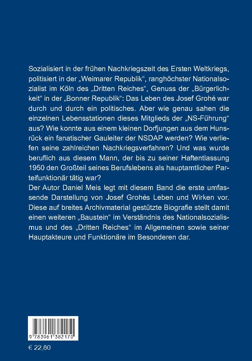 Der Autor Daniel Meis legt mit diesem Band die erste umfassende Darstellung von Josef Grohés Leben und Wirken vor. Diese auf breites Archivmaterial gestützte Biografie stellt damit einen weiteren „Baustein“ im Verständnis des Nationalsozialismus und des „Dritten Reiches“ im Allgemeinen sowie seiner Hauptakteure und Funktionäre im Besonderen dar.