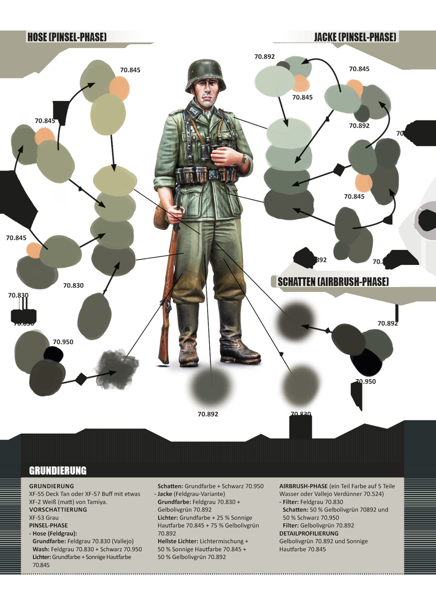 Im zweiten Teil von "Diorama Projekt" geht es um die Bemalung der zu den Dioramen gehörigen Figuren. Diesmal wirkten wieder mit: Frederik Astier, Jari Hemila, Fabrizio Pincelli, Adam Wilder und Fernando González.Im ersten Teil des Buches werden Arbeitsplatz, die Farben und andere benötigte Materialien sowie der Zusammenbau der Figuren vorgestellt. Hauptaugenmerk liegt aber dann auf den Maltechniken. Es werden die Grundlagen der Uniform- und Gesichtsbemalung gezeigt, darüber hinaus aber auch die verschiedensten Techniken. Das Malen mit Pinsel und Airbrush wird gleichrangig behandelt. Ein Hauptthema sind die Alterungseffekte.Im zweiten Teil des Buches wird die Bemalung an ganz konkreten Figuren verschiedener Streitkräfte des Zweiten Weltkrieges gezeigt:- Deutscher Infanterist- U.S. Streitkräfte - Marines auf Iwo Jima- Sowjetische Streitkräfte- Japanische ArmeeDen Abschluss bildet wieder die Gallerie mit Fotos von Dioramen.