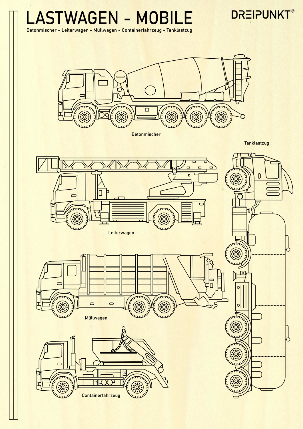 Ein Mobile mit 5 verschiedenen Lastwagen. neben dem Spaß beim Aussägen und Bemalen dieser tollen Fahrzeuge erhältst du auch noch ein Mobile, das dir oder deinem Kind lange Zeit viel Spaß bereiten wird. Laubsägearbeiten bieten nicht nur stundenlangen Bastelspaß, sie fördern auch die Entwicklung von Kindern in den Bereichen Konzentration und motorische Fähigkeiten. Packungsinhalt: - Laubsägevorlage aus 3mm Pappelsperrholz - Betonmischer - Tanklastzug - Leiterwagen - Müllwagen - Containerfahrzeug - Lasergraviertes Holz für perfekte Ergebnisse - Vorgeschnittene Mikro-Löcher für Zwirnsfäden (Fäden nicht enthalten) - Mobile-Stangen sind im Set enthalten! - Aufbauhinweise zum Mobile für sicheres Gelingen - eMail-Link an den Support für Fragen, die beim Bau auftreten können Ob für dich selbst oder für deine Kinder oder Enkel: Genieße ein tolles Hobby mit hochwertigen Laubsägevorlagen aus dem Hause DREIPUNKT®!