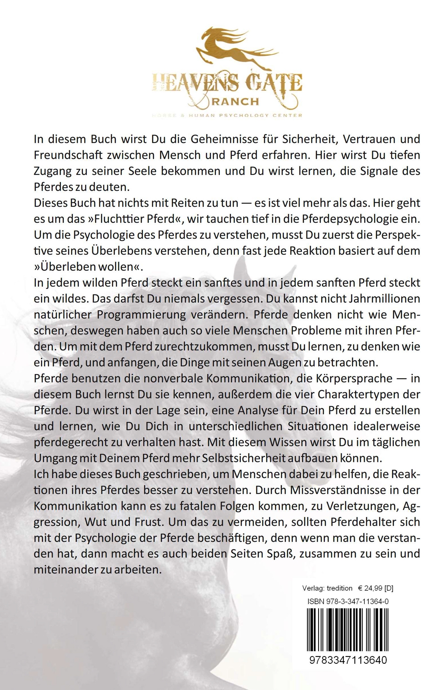 In diesem Buch wirst Du die Geheimnisse für Sicherheit, Vertrauen und Freundschaft zwischen Mensch und Pferd erfahren. Hier wirst Du tiefen Zugang zu seiner Seele bekommen und Du wirst lernen, die Signale des Pferdes zu deuten. Dieses Buch hat nichts mit Reiten zu tun - es ist viel mehr als das. Hier geht es um das »Fluchttier Pferd«, wir tauchen tief in die Pferdepsychologie ein. Um die Psychologie des Pferdes zu verstehen, musst Du zuerst die Perspektive seines Überlebens verstehen, denn fast jede Reaktion basiert auf dem »Überleben wollen«. In jedem wilden Pferd steckt ein sanftes und in jedem sanften Pferd steckt ein wildes. Das darfst Du niemals vergessen. Du kannst nicht Jahrmillionen natürlicher Programmierung verändern. Pferde denken nicht wie Menschen, deswegen haben auch so viele Menschen Probleme mit ihren Pferden. Um mit dem Pferd zurechtzukommen, musst Du lernen, zu denken wie ein Pferd, und anfangen, die Dinge mit seinen Augen zu betrachten. Pferde benutzen die nonverbale Kommunikation, die Körpersprache - in diesem Buch lernst Du sie kennen, außerdem die vier Charaktertypen der Pferde. Du wirst in der Lage sein, eine Analyse für Dein Pferd zu erstellen und lernen, wie Du Dich in unterschiedlichen Situationen idealerweise pferdegerecht zu verhalten hast. Mit diesem Wissen wirst Du im täglichen Umgang mit Deinem Pferd mehr Selbstsicherheit aufbauen können. Ich habe dieses Buch geschrieben, um Menschen dabei zu helfen, die Reaktionen ihres Pferdes besser zu verstehen. Durch Missverständnisse in der Kommunikation kann es zu fatalen Folgen kommen, zu Verletzungen, Aggression, Wut und Frust. Um das zu vermeiden, sollten Pferdehalter sich mit der Psychologie der Pferde beschäftigen, denn wenn man die verstanden hat, dann macht es auch beiden Seiten Spaß, zusammen zu sein und miteinander zu arbeiten.