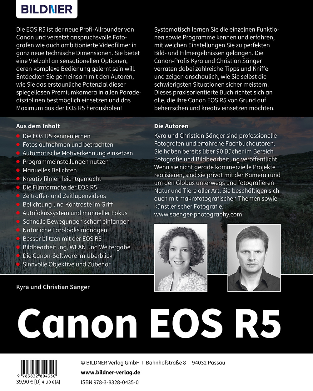 lt;p>Die EOS R5 ist der neue Profi-Allrounder von Canon und versetzt anspruchsvolle Fotografen wie auch ambitionierte Videofilmer in ganz neue technische Dimensionen. Sie bietet eine Vielzahl an sensationellen Optionen, deren komplexe Bedienung gelernt sein will. Entdecken Sie gemeinsam mit den Autoren, wie Sie das erstaunliche Potenzial dieser spiegellosen Premiumkamera in allen Paradedisziplinen bestmöglich einsetzen und das Maximum aus der EOS R5 herausholen! Systematisch lernen Sie die einzelnen Funktionen sowie Programme kennen und erfahren, mit welchen Einstellungen Sie zu perfekten Bild- und Filmergebnissen gelangen. Die Canon-Profis Kyra und Christian Sänger verraten dabei zahlreiche Tipps und Kniffe und zeigen anschaulich, wie Sie selbst die schwierigsten Situationen sicher meistern. Dieses praxisorientierte Buch richtet sich an alle, die ihre Canon EOS R5 von Grund auf beherrschen und kreativ einsetzen möchten.