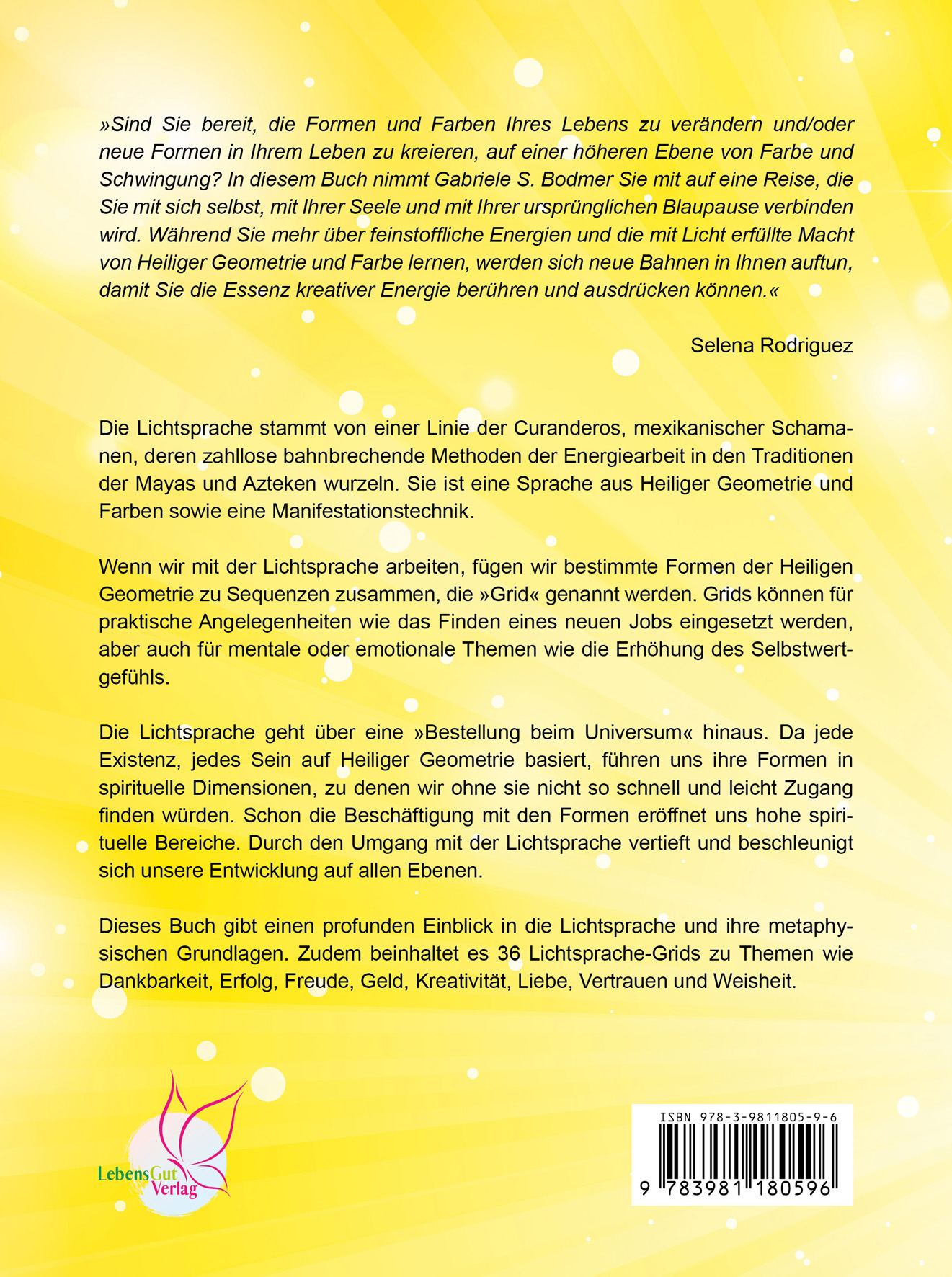 "Sind Sie bereit, die Formen und Farben Ihres Lebens zu verändern und/oder neue Formen in Ihrem Leben zu kreieren, auf einer höheren Ebene von Farbe und Schwingung? In diesem Buch nimmt Gabriele S. Bodmer Sie mit auf eine Reise, die Sie mit sich selbst, mit Ihrer Seele und mit Ihrer ursprünglichen Blaupause verbinden wird. Während Sie mehr über feinstoffliche Energien und die mit Licht gefüllte Macht von Heiliger Geometrie und Farbe lernen, werde sich neue Bahnen in Ihnen auftun, damit Sie die Essenz kreativer Energie berühren und ausdrücken können."