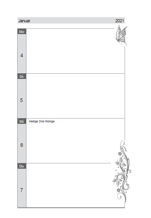 12 Monate planen und organisieren in den insgesamt 12 Übersichten zu den Monaten Januar bis Dezember 2021. Termin Erinnerung eintragen oder auch als Kalender Tagebuch mit dem Wochenplaner führen.