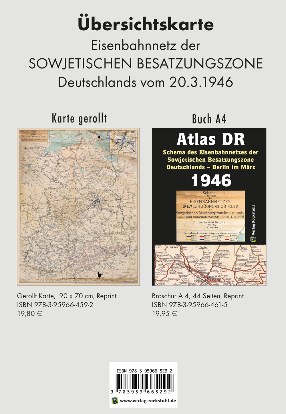 Jahresfahrplan. Gültig ab 4. November 1946, Taschenbuch 17 x 24 cm, 178 Seiten, Reprint.In dieser Ausgabe fehlt der Erklärungsteil von Seite 1 bis 41 und beginnt mit den "Allgemeinen Bestimmungen für Reisende".Dafür enthalten der schwarz/weiß Abdruck der "ÜBERSICHTSKARTE März 1946 - Eisenbahnnetz der SOWJETISCHEN BESATZUNGSZONE Deutschlands". Diese ÜBERSICHTSKARTE ist auch gerollt (ISBN 978-3-95966-459-2) und als Buch (ISBN 978-3-95966-461-5) extra erhältlich.
