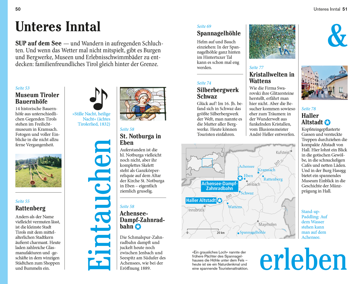 Senkrechtstarter, Überflieger, Querfeldein. Vor Ort - die Kapitel: Von Kufstein bis Kitzbühel, Unteres Inntal, Innsbruck und Umgebung, Imst und Außerfern, Das Oberland, Osttirol. Das Kleingedruckte (Reiseinfos von A bis Z). Das Magazin. Offene Fragen.