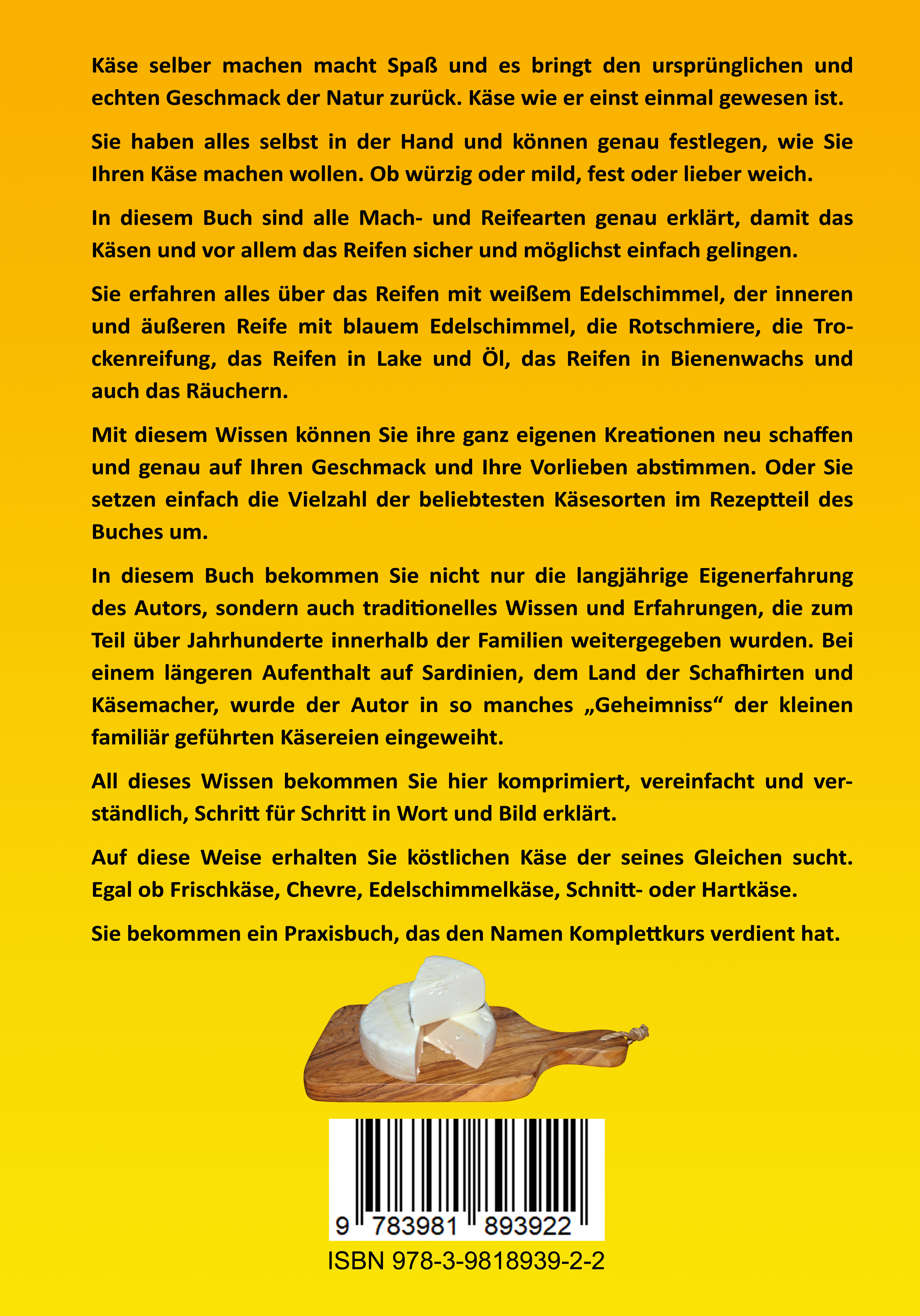 Mit den beliebtesten Käse-Rezepten für alle Käsearten aus Ziegen- Schaf- und Kuhmilch.Es spielt keine Rolle, ob Sie noch Neuling sind, oder bereits Erfahrungen gesammelt haben!Alle Reifearten für Rotschmiere, die innere und äußere Reifung mit unterschiedlichen Schimmelarten, die Reife in Salzlake oder Öl, die Trockenreifung und die Reife in Wachs sind einfach und verständlich beschrieben.Abgerundet wird das Ganze durch eine XXL Räucheranleitung.Der Ratgeber holt Sie da ab, wo Sie gerade stehen176 Seiten geballtes Praxiswissen rund um diese Bereiche:Die Werkzeuge zum Käse machenDer Rohstoff, die MilchDas Lab und dessen unterschiedliche FormenDie unterschiedlichen SalzeAromatisierung durch Kräuter, Gewürze und BlumenHilfs- und Zusatzstoffe, Kulturen für die ReifungSchimmel und Bakterien für die ReifungHygiene beim KäsemachenDie Käseformen und das Abfüllen des BruchsDie Räumlichkeiten zur KäseherstellungDie Vorbehandlung der MilchDas Bereiten der Gallerte und des BruchsSteuerung der späteren Käse-KonsistenzEntmolkung und FormgebungPressen des Käses und FormgebungSalzen und RindenbildungVerwertung der MolkeAusführliche Erläuterungen zu allen ReifeartenKäse reinigen, schneiden, verpacken und lagernMögliche Fehler bei der Käseherstellung und deren VermeidungEine extra große Räucheranleitung zum Kalt- und Heißräuchern, unterschiedliche Aromatisierungs- und Räuchermethoden, sowie eine Auflistung typischer Fehler beim Räuchern und wie man sie vermeidetDas Buch nimmt Sie bei der Hand, und zeigt Ihnen Schritt für Schritt, wie alles gemacht wird, so gelingt es garantiert!