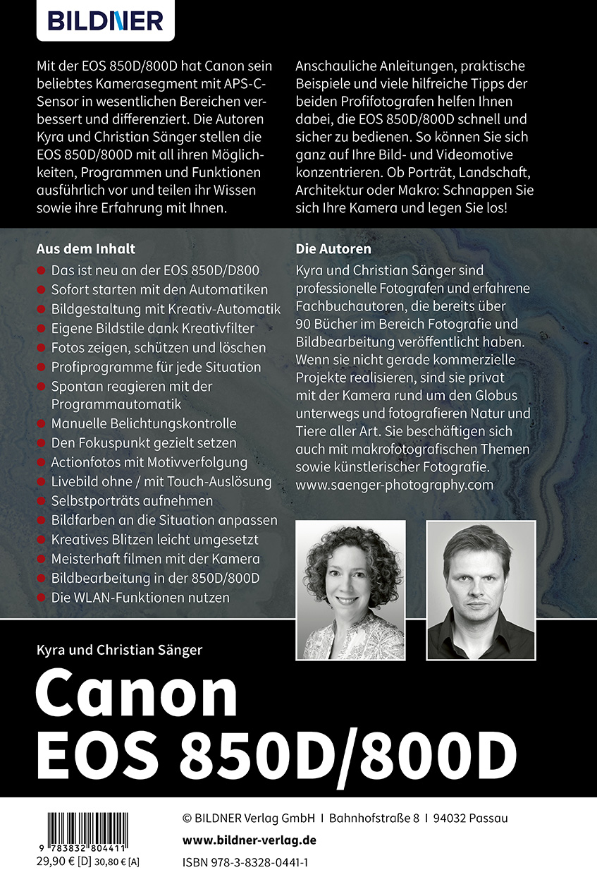 lt;p>Mit der EOS 800D/850D hat Canon sein beliebtes Kamerasegment mit APS-C-Sensor in wesentlichen Bereichen verbessert und differenziert. Die Autoren Kyra und Christian Sänger stellen die EOS 800D/850D mit all ihren Möglichkeiten, Programmen und Funktionen ausführlich vor und teilen ihr Wissen sowie ihre Erfahrung mit Ihnen. Anschauliche Anleitungen, praktische Beispiele und viele hilfreiche Tipps der beiden Profifotografen helfen Ihnen dabei, die EOS 800D/850D schnell und sicher zu bedienen. So können Sie sich ganz auf Ihre Bild- und Videomotive konzentrieren. Ob Porträt, Landschaft, Architektur oder Makro: Schnappen Sie sich Ihre Kamera und legen Sie los!