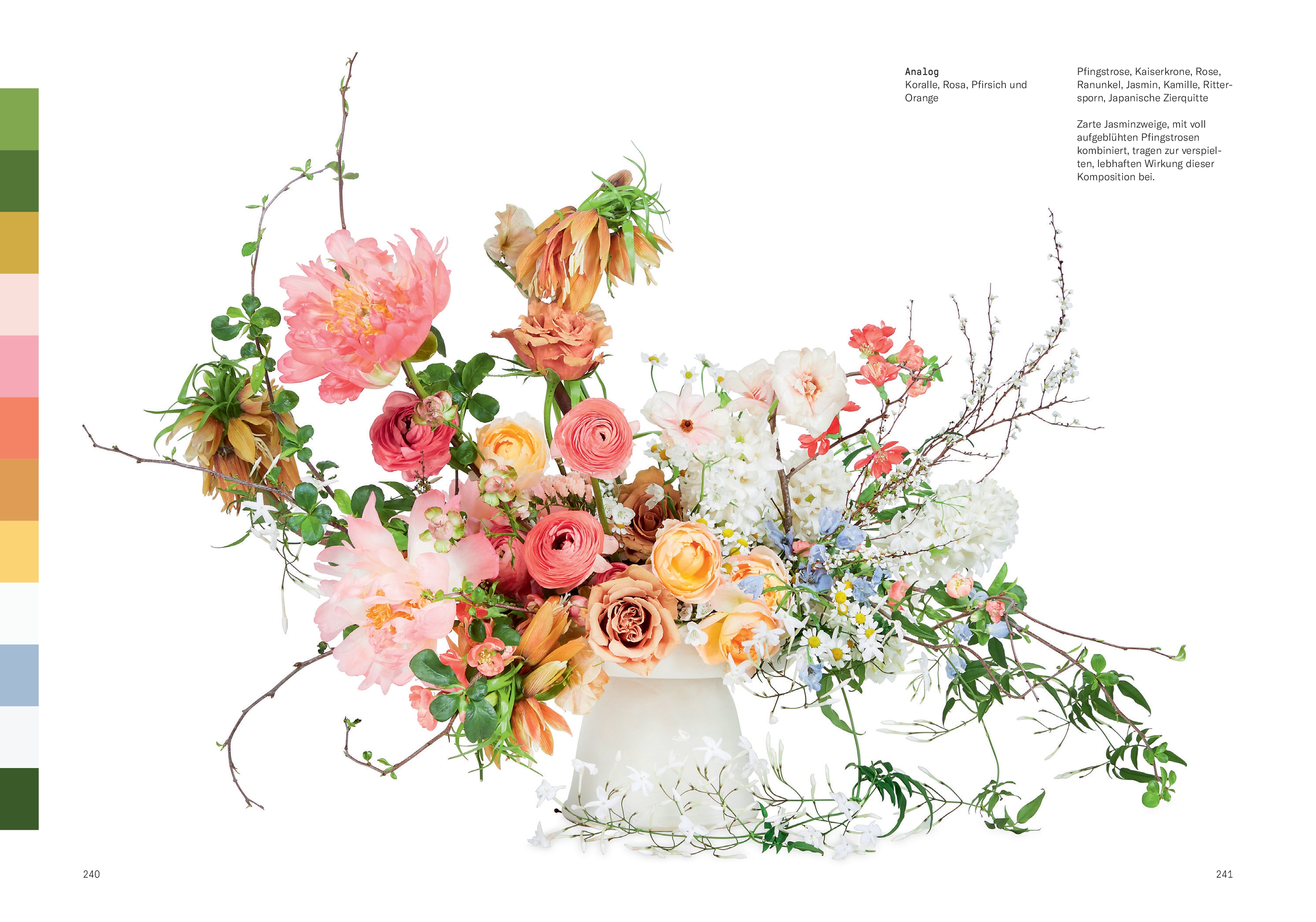 Das Buch enthält 175 Arrangements, die unzählige Möglichkeiten aufzeigen, um Blumen unterschiedlicher Farbtöne miteinander zu kombinieren. Die Designs orientieren sich an Farbschemata. Sie umfassen analoge, komplementäre, monochromatische und triadische Farben sowie Übergangsfarben und Farbakzente.