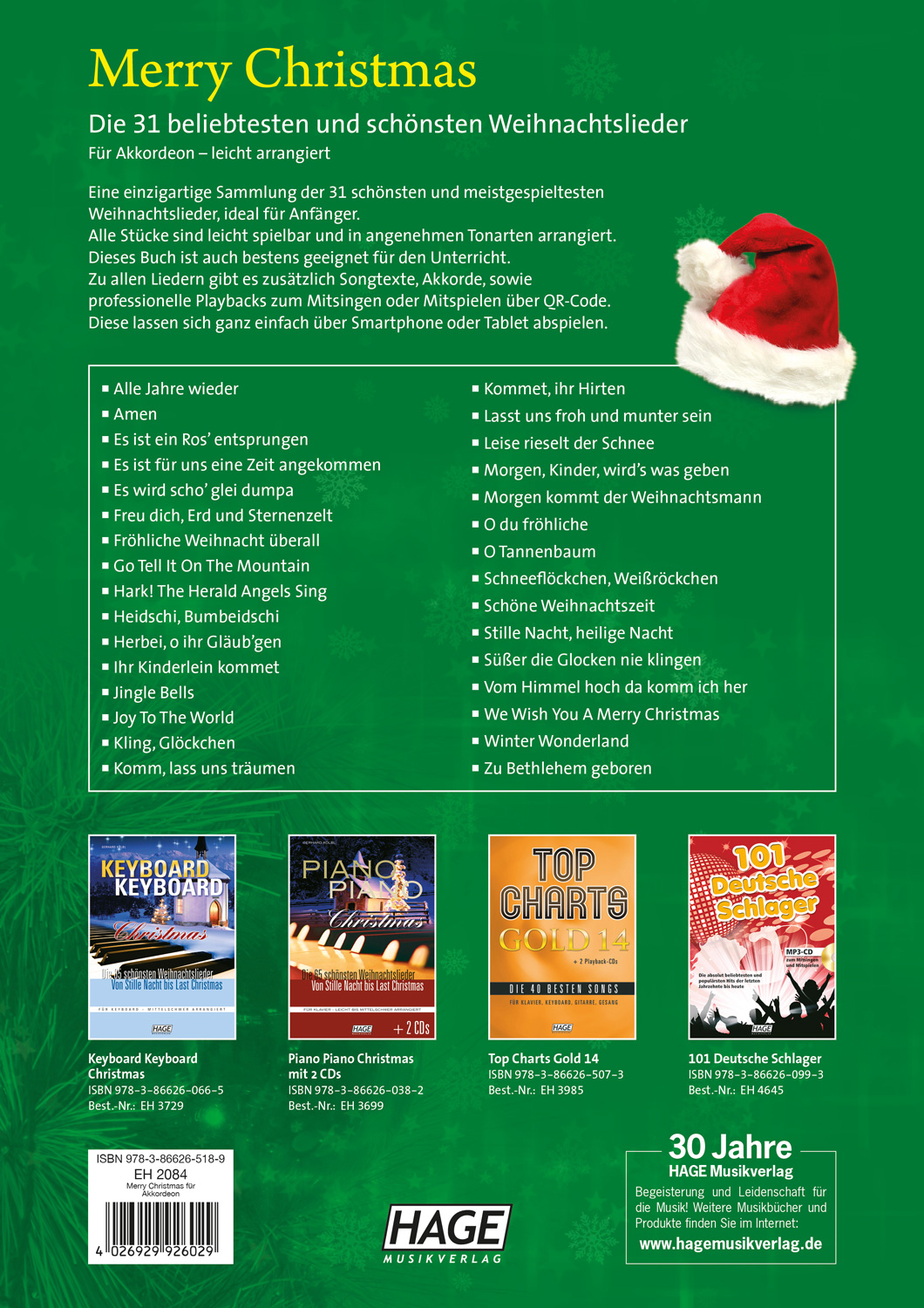 Eine einzigartige Sammlung der 31 schönsten und meistgespieltesten Weihnachtslieder für Akkordeon, ideal für Anfänger und Wiedereinsteiger. Alle Stücke sind leicht spielbar und in angenehmen Tonarten arrangiert. Dieses Buch ist auch bestens geeignet für den Unterricht. Zu allen Liedern gibt es zusätzlich Songtexte und Akkorde. Über die QR-Codes gelangt man zu professionellen Playbacks, die man ganz einfach über Smartphone oder Tablet abspielen kann. Denn mit einer kompletten Band im Hintergrund macht das Spielen und Singen so richtig Spaß. Natürlich können die Weihnachtslieder auch solo (also ohne Playback-Begleitung) gespielt werden.
