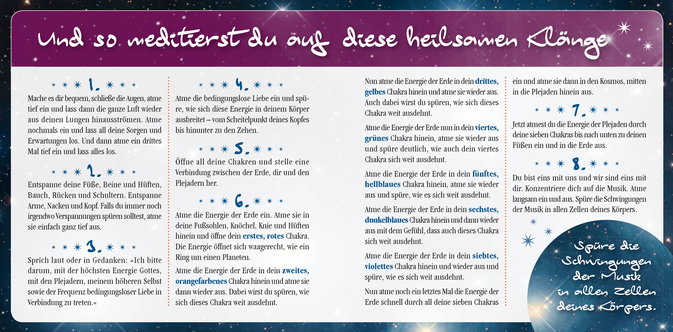 UND SO MEDITIERST DU AUF DIESE HEILSAMEN KLÄNGE ... 1. Mache es dir bequem, schließe die Augen, atme tief ein und lass dann die ganze Luft wieder aus deinen Lungen hinausströmen. Atme nochmals ein und lass all deine Sorgen und Erwartungen los. Und dann atme noch ein drittes Mal tief ein und lass alles los. 2. Entspanne deine Füße, Beine und Hüften, Bauch, Rücken und Schultern, Arme, Nacken und Kopf. Falls du immer noch irgendwo Verspannungen spüren solltest, atme sie einfach aus. 3. Sprich laut oder in Gedanken: »Ich bitte darum, mit der höchsten Energie Gottes, mit den Plejadern, meinem höheren Selbst und der Frequenz bedingungsloser Liebe in Kontakt zu treten.« 4. Atme die bedingungslose Liebe ein und spüre, wie sich diese Energie in deinem Körper ausbreitet – vom Scheitelpunkt deines Kopfes bis zu den Zehen. 5. Öffne deine Chakren und stelle eine Verbindung zwischen der Erde, dir und den Plejadern her. 6. Atme die Energie der Erde ein. Atme sie in deine Fußsohlen, Knöchel, Knie und Hüften hinein und öffne dein erstes, rotes Chakra. Die Energie öffnet sich waagerecht, wie ein Ring um einen Planeten. Atme die Energie der Erde in dein zweites, orangefarbenes Chakra hinein und atme sie dann wieder aus. Dabei wirst du das Gefühl haben, dass sich dieses Chakra weit ausdehnt. Nun atme die Energie der Erde in dein drittes, gelbes Chakra hinein und atme sie wieder aus. Auch dabei wirst du spüren, wie sich dieses Chakra weit ausdehnt. Atme die Energie der Erde nun in dein viertes, grünes Chakra hinein, atme sie wieder aus und spüre, wie dein viertes Chakra sich weit ausdehnt. (...)