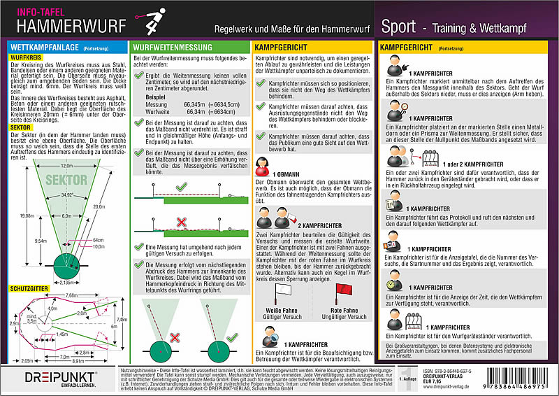 Der Hammer ist ein Sportgerät, das ursprünglich in Schottland und Irland bei sportlichen Wettkämpfen verwendet wurde.Der Hammerwurf ist heute eine olympische Disziplin, bei der eine an einem Stahlseil befestigte Kugel möglichst weit geworfen wird.Bei der Durchführung der Wettkämpfe gibt es eine Vielzahl verschiedener Regeln und Vorgaben zu beachten: Von den Maßen und Gewichten des Sportgeräts über die erlaubten Wurftechniken bis hin zum genauen Aufbau der Wettkampfanlage.Auf dieser zweiseitigen Info-Tafel findest du alle Informationen zum Hammerwurf - ob du als Wettkämpfer antrittst oder in der Organisation tätig bist: Hier hast du alle Angaben auf einen Blick!Aus dem Inhalt:- Allgemeines- Hammer- Wettkampf- Wettkampfanlage- Wurfweitenmessung- KampfgerichtDurch die wasserfeste Laminierung kann die Info-Tafel jederzeit zum Training oder zum Wettkampf mitgenommen werden - bei jedem Wetter!Nach den offiziellen Regeln des DLV, anschaulich erklärt und gut verständlich aufbereitet.