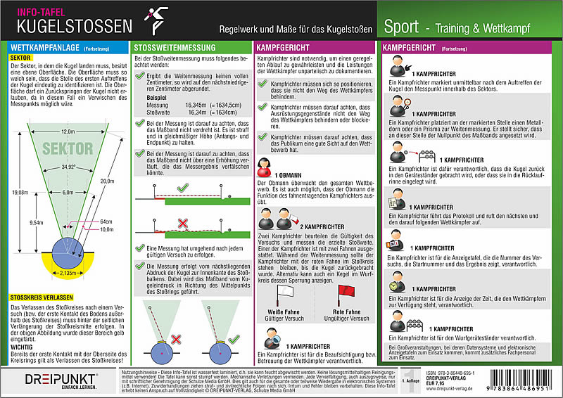 Beim Kugelstoßen versuchen die Athleten, das Sportgerät (die Kugel) auf eine bestimmte Weise möglichst weit zu stoßen.Vorläufer des Kugelstoßens gab es bereits in der Antike, in seiner jetzigen Form ist die Disziplin seit 1896 Bestandteil der Olympischen Spiele.Bei der Durchführung der Wettkämpfe gibt es eine Vielzahl verschiedener Regeln und Vorgaben zu beachten: Von Vorgaben zum Sportgerät über die genauen Abläufe beim Stoß bis hin zum Aufbau der Wettkampfanlage.Auf dieser zweiseitigen Info-Tafel findest du alle Informationen zum Kugelstoßen - ob du als Wettkämpfer antrittst oder in der Organisation tätig bist: Hier hast du alle Angaben auf einen Blick!Aus dem Inhalt:- Allgemeines- Wettkampfgerät Kugel- Wettkampf- Wettkampfanlage- Stoßweitenmessung- KampfgerichtDurch die wasserfeste Laminierung kann die Info-Tafel jederzeit zum Training oder zum Wettkampf mitgenommen werden - bei jedem Wetter!Nach den offiziellen Regeln des DLV, anschaulich erklärt und gut verständlich aufbereitet.