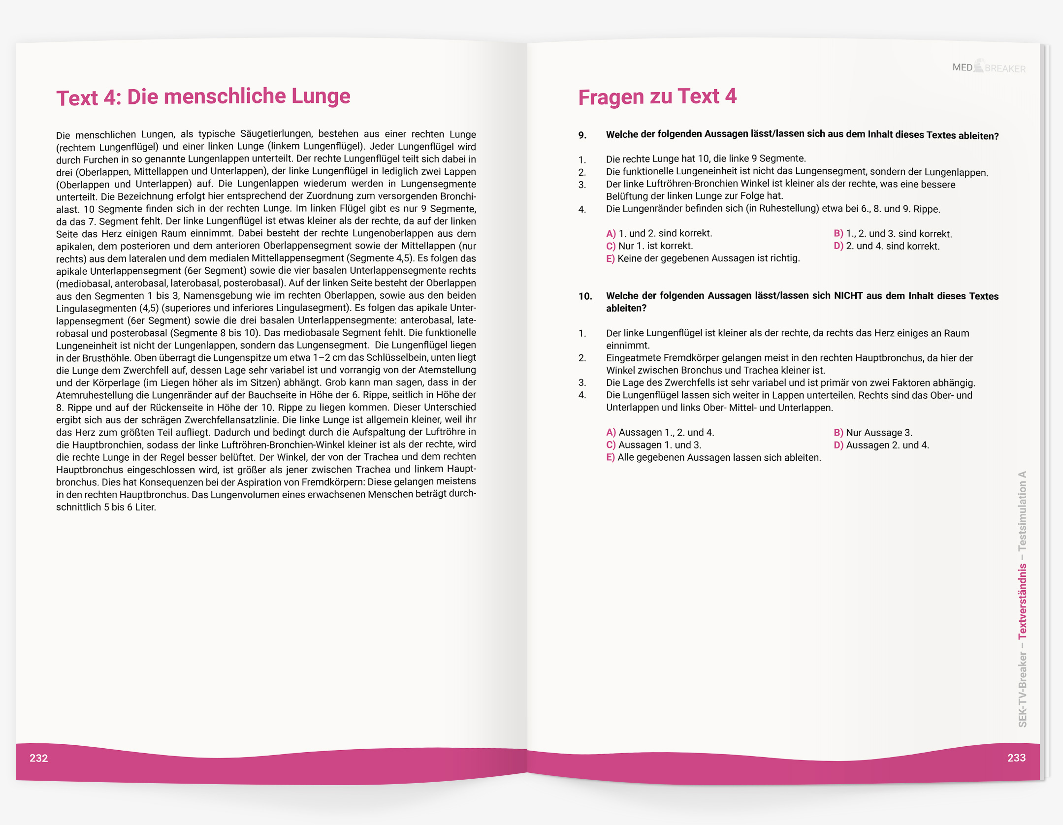 Der SEK-TV-Breaker ist das Übungsbuch für die Sozial-Emotionalen-Kompetenzen und dem Textverständnis im österreichischen Medizin-Aufnahmetest (MedAT-H). Der SEK-TV-Breaker bereitet dich mit testnahen Übungsbeispielen auf die Untertests Emotionen erkennen, Soziales Entscheiden und dem Verständnis von Texten im Medizinertest optimal vor. Insgesamt 320 Übungsaufgaben ermöglichen dir beim Auswahlverfahren am Testtag das Beste aus dir zu holen. Die Inhalte des Buches wurden im Vorfeld von hunderten Personen getestet. Besonders gelungen ist deshalb der Untertest Emotionen erkennen, hier wurde auf Basis der Evaluierung jede Emotion genauestens geprüft. Zusätzlich führen die detaillierten E-Learning-Erklärungen und -Tipps bei den Textverständnis-Aufgaben zum raschen Verständnis. So erzielst du zeitsparend die optimale Verbesserung deiner Fähigkeiten. Für die Vorbereitung auf den BMS empfiehlt sich der BMS-Breaker und MedAT HERO, für den kognitiven Teil der Med-Breaker. Alle Bücher befinden sich im MEDBREAKER | MedAT-Erfolgspaket. Im SEK-TV-Breaker enthalten sind: