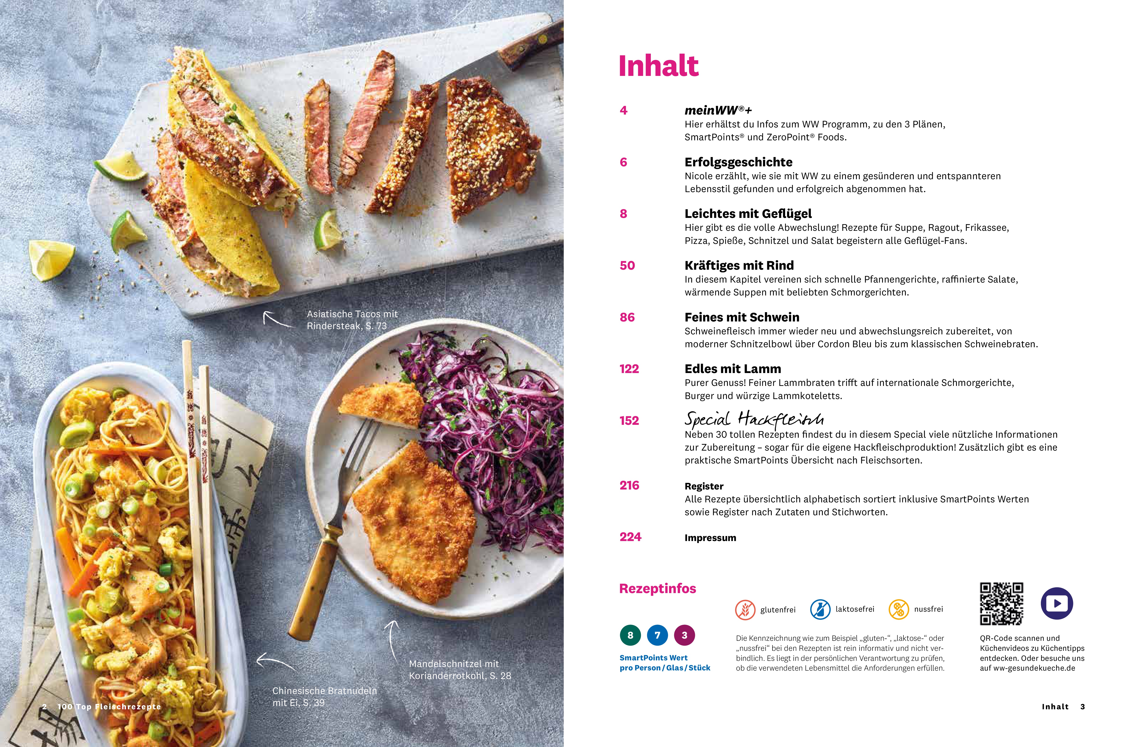 Dieses Rezeptbuch bietet Inspiration für alle, die sich mit Fleisch gesund und figurbewusst ernähren möchten. Da wären zum einen die Klassiker: Wiener Schnitzel, Rinderschmorbraten, Spaghetti Bolognese oder Königsberger Klopse - allesamt alltagstaugliche Rezepte, die der ganzen Familie schmecken. Doch warum nicht einmal eine moderne Rezeptidee wie Pulled Chicken Burger oder Schnitzelbowl mit Salsa ausprobieren - tolle Genuss-Alternativen zu Bewährtem? WW - 100 Top Fleischrezepte ist somit ein unentbehrliches Standardwerk für gesundheits- und figurbewusste Genießer.