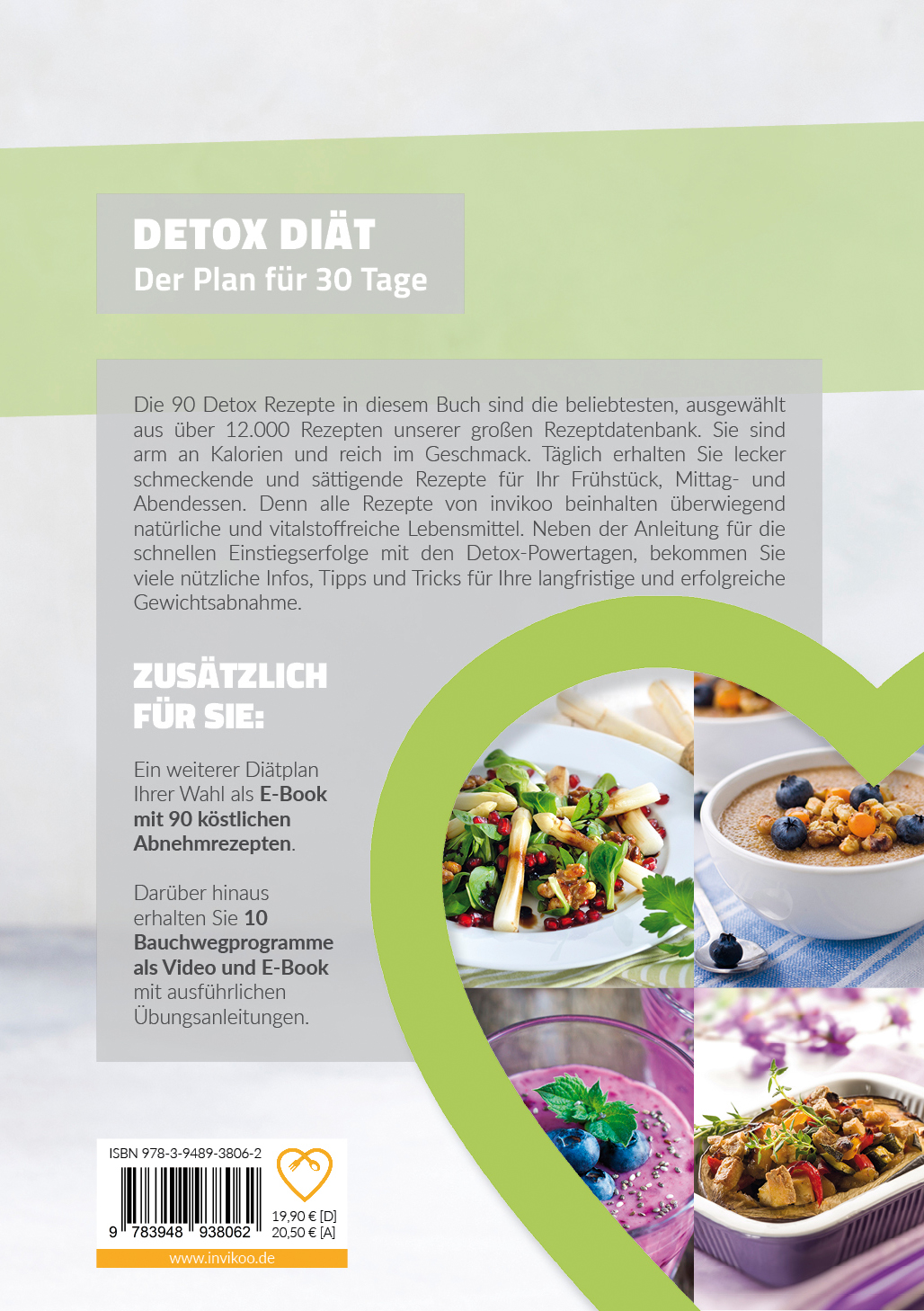 Wenn unsere Entgiftungs-Organe wie Leber, Nieren und Haut überfordert sind, wird der Teint fahl und der Körper anfällig für Krankheiten. Wir fühlen uns schlapp und ausgelaugt. Auch eine Gewichtszunahme, Kopfschmerzen, Schlaflosigkeit und Sodbrennen können Folgen einer Überlastung von Zucker, Alkohol und anderen Giften sein. In diesem Fall profitiert Ihre Gesundheit von diesem Detoxprogramm und Sie verlieren auch noch einige Kilos dabei.Die 90 Detox Rezepte in diesem Diätplan sind die beliebtesten, ausgewählt aus über 12.000 Rezepten der invikoo Rezeptdatenbank. Täglich gibt es lecker schmeckende und sättigende Rezepte für das Frühstück, Mittag- und Abendessen. Neben der Anleitung für die schnellen Einstiegserfolge mit den 3 Power Detoxtagen, bekommt der Leser viele nützliche Infos, Tipps und Tricks für die langfristige und erfolgreiche Gewichtsabnahme.Bonus 1: Zusätzlich zum Buch erhalten Sie einen weiteren Diätplan mit 90 Rezepten als E-Book. Sie haben die Wahl zwischen Clean Eating, Vegan, Vegetarisch, Low Carb, Low Fat und der Eiweiß-Diät und können Ihren Kalorienbedarf auswählen. Zur Wahl stehen 1000-1200 kcal, 1200-1500 kcal und 1500-1800 kcal. Bonus 2: Fünf 10 Minuten Bauchweg Workouts mit ausführlicher schriftlicher Anleitung und als Video.