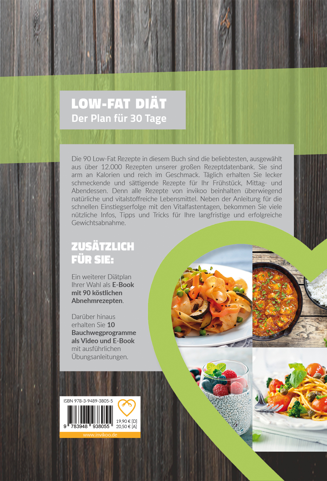 Abnehmen mit der Low Fat Diät kommt dem Prinzip "Abnehmen ohne Hungern" am nächsten. Denn Fett ist das Lebensmittel mit der höchsten Energiedichte. Wird dieser Anteil reduziert, kann dafür mehr als das doppelte von Kohlenhydraten und Eiweiß gegessen werden. Low Fat lässt sich auch leicht umsetzten, da sie sehr alltagstauglich ist und man alle Lebensmittel essen darf. Nur vom Fett eben etwas weniger. Die Teilnehmer berichten immer wieder darüber, wie schmackhaft diese Ernährungsform ist, dass man sie gut ein Leben lang beibehalten kann und das die Mahlzeiten richtig gut sättigen.Die 90 fettarmen Rezepte in diesem Buch sind die beliebtesten, ausgewählt aus über 12.000 Rezepten der invikoo Rezeptdatenbank. Täglich gibt es lecker schmeckende und sättigende Rezepte für das Frühstück, Mittag- und Abendessen. Neben der Anleitung für die schnellen Einstiegserfolge mit den 3 Vitalfastentagen, bekommt der Leser viele nützliche Infos, Tipps und Tricks für die langfristige und erfolgreiche Gewichtsabnahme.Bonus 1: Zusätzlich zum Buch erhalten Sie einen weiteren Diätplan mit 90 Rezepten als E-Book. Sie haben die Wahl zwischen Low Carb, Vegan, Clean Eating, Eiweiß-Diät, sowie Vegetarisch und können Ihren Kalorienbedarf auswählen. Zur Wahl stehen 1000-1200 kcal, 1200-1500 kcal und 1500-1800 kcal. Bonus 2: Zehn 10 Minuten Bauchweg Workouts mit ausführlicher schriftlicher Anleitung und als Video.