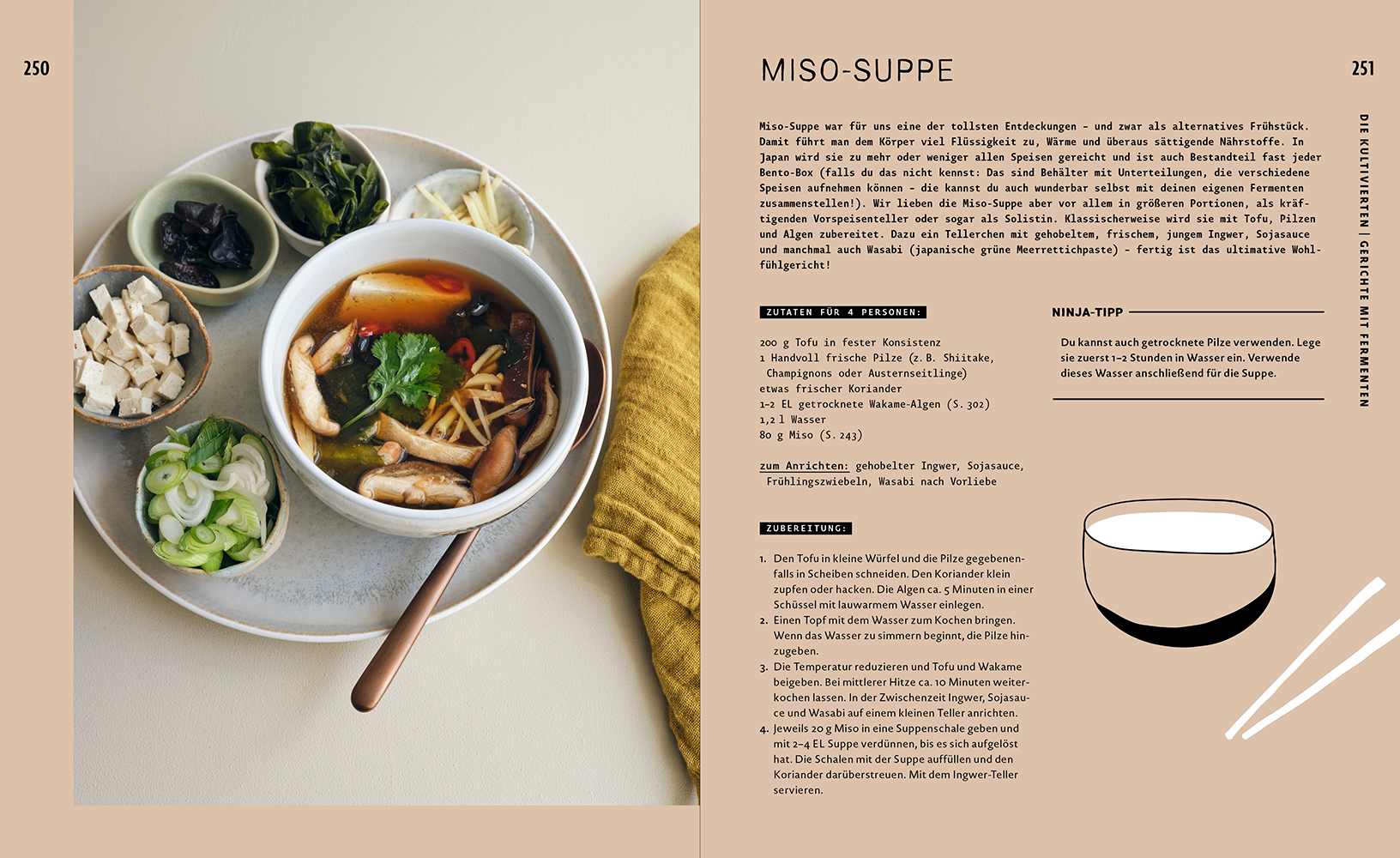Dieses Buch wird klimapositiv hergestellt, cradle-to-cradle gedruckt und bleibt plastikfrei unverpackt.GEMÜSE MIT GÄRFAKTOR: TAUCH AB MIT KIMCHI, KOMBUCHA UND CO.!Es blubbert und zischt, PRICKELT UND GLUCKST, erstrahlt in allen Farben der Welt und wird dich auf eine SAGENHAFTE GESCHMACKSREISE mitnehmen. Was hier los ist? Ist doch klar: FERMENTIEREN,BABY! Schick dein GEMÜSE AUF TAUCHSTATION, züchte deine eigenen Bakterien - und schaff dir damit UNGLAUBLICHE GERICHTE UND GETRÄNKE, die nicht nur lange haltbar sind und einzigartig schmecken, sondern mit ihren vitaminreichen und PROBIOTISCHEN INHALTSSTOFFEN auch noch richtig guttun. Nase rümpfen? Nicht doch: Was anfangs etwas gewöhnungsbedürftig anmutet, WIRD DICH SCHNELL IN SEINEN BANN ZIEHEN. Eins ist klar: Wer einmal anfängt, hört nicht mehr auf. Ab jetzt bist du ständig auf der Suche nach neuen Rezepten, SPRICHST DEINEM SAUERTEIG GUT ZU, ZÄHLST EINMACHGLÄSER BEIM EINSCHLAFEN und bringst deine Vorratsregale fast zum Einstürzen. Deine wilde, saure Seite kommt zum Vorschein - du wirst zum Fermentier!AB INS GLAS, DECKEL DRAUF - UND ABWARTEN, WAS PASSIERT.Aber der Reihe nach: Damit du vor lauter Fermentations-Fieber nicht untergehst, findest du in diesem Buch DETAILLIERTE ANLEITUNGEN ZU DEN VERSCHIEDENEN TECHNIKEN: von der KRAUT- UND LAKETECHNIK bis zum selbst gemachten ESSIG, von der JOGHURTKULTUR bis zum WASSERKEFIR. Du erfährst, wie man richtig schnippelt, knetet, siebt, auspresst, mixt und einlagert. IN 150 REZEPTEN LERNST DU DIE GEBALLTE GESCHMACKSVIELFALT DES FERMENTIERENS KENNEN - koste dein unfassbar würziges Kimchi, und du fühlst dich mit einem Schlag auf Asienreise versetzt. Immer mit dabei: REZEPTIDEEN AUS ALLER WELT, in denen deine Fermente die Hauptrolle spielen. Wie wär's mit einem Tempeh-Burger? Oder einem erfrischenden Kefir-Colada? Mit den Tipps der FERMENTATION NINJA MARCEL KRUSE UND GERU PULSINGER wirst du jedenfalls ganz einfach und Schritt-für-Schritt in das Fermentier-Universum abtauchen. Sie haben massenhaft TRICKS UND GEHEIMNISSE auf Lager, die dir helfen, zum GÄRGEMÜSE-FLÜSTERER zu werden. Und wenn dann doch mal etwas schiefgehen sollte: Schimmel abkratzen und dich in Gelassenheit üben. Denn auch das gehört zum Fermentieren: ABWARTEN UND KOMBUCHA TRINKEN.FERMENTIEREN IST ... SCHNIPPELN, KNETEN, EXPERIMENTIEREN. UND: NACHHALTIGE GESCHMACKSEXPLOSIONEN ERLEBEN.Das Beste? Du kannst SOFORT LOSLEGEN. Das Einzige, was du brauchst, sind Einmachgläser, Gewichte zum Beschweren und vielleicht die ein oder andere Starterkultur - die du immer wieder weiterzüchten kannst. Und natürlich jede Menge Obst, Gemüse, Kräuter, Mehl oder Milch ... oder einfach ALLES, WAS DU IM GARTEN, IM WALD UND AUF DER WIESE FINDEST. Ja, genau: Du kannst nicht nur deine Gartenschätze, die deine Beete im Sommer überwuchern, ganzjahrestauglich einlegen, sondern ALLE MÖGLICHEN ZUTATEN IN DEINE GLÄSER VERFRACHTEN. Damit kannst du ausprobieren, experimentieren - und deinen Fermenten ein zufriedenes Glucksen entlocken. WAS REGIONAL WÄCHST, VERWANDELT SICH IN KUNTERBUNTE, INTERNATIONALE GERICHTE - OHNE AUFWAND, ENERGIEVERSCHWENDUNG UND OHNE MÜLL. Quasi ganz von selbst. Wer fermentiert, tut sich selbst und der Umwelt etwas Gutes und kann die Freiheit erleben, eigene, KOMPLETT NEUE LEBENSMITTEL UND GESCHMÄCKER ZU ERSCHAFFEN - die mit absoluter Sicherheit zum nächsten Lieblingsessen werden. Also, mach's deinem Gemüse nach: LUFT ANHALTEN UND LOSBLUBBERN!- TAUCH MIT DEINEM GEMÜSE AB, werde süßsauer mit Essig und Kefir, gäre mit Natt und Tempeh um die Wette. MIT DIESEN 150 REZEPTEN ENTDECKST DU VÖLLIG NEUE GESCHMACKSWELTEN und erfährst alles darüber, wie du zum richtigen Fermentier wirst: schnippeln, kneten, versenken und losblubbern!- Alles, was du fermentierst, ist probiotisch und leicht verdaulich - sprich: UNGLAUBLICH GESUND. Das passt in JEDEN SPEISEPLAN UND FÜR JEDE KÖNNERSTUFE: starte gleich los mit den Basics und FERMENTIERE DICH IN ZISCHENDE SPHÄREN.- FERMENTIEREN MACHT SÜCHTIG: Wenn d