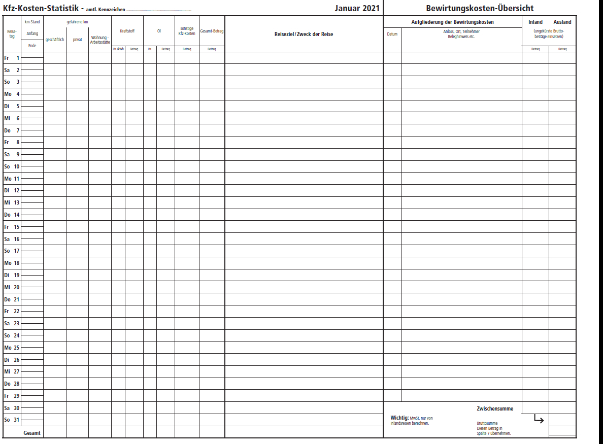 •Monatliche Reisekosten-Abrechnung/Kfz-Kosten-Statistik/Bewirtungskosten-Übersicht als übersichtliches Formular im Format DIN A3 (12 Monatsblätter mit Kalendarium+ 2 Ersatzblätter),