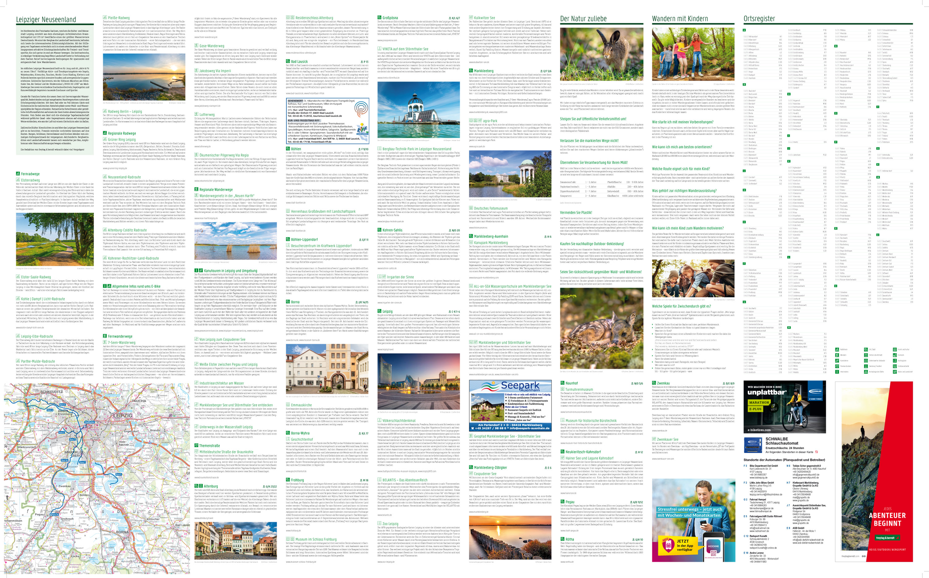 Die Wanderkarte Leipziger Neuseenland bietet detaillierte Informationen über die verschiedenen Wander- und Radwege in der Region. Mit der Wander- und Radkarte können Sie Ihre Touren ideal planen und sich über Sehenswürdigkeiten und Aussichtspunkte entlang des Weges informieren.