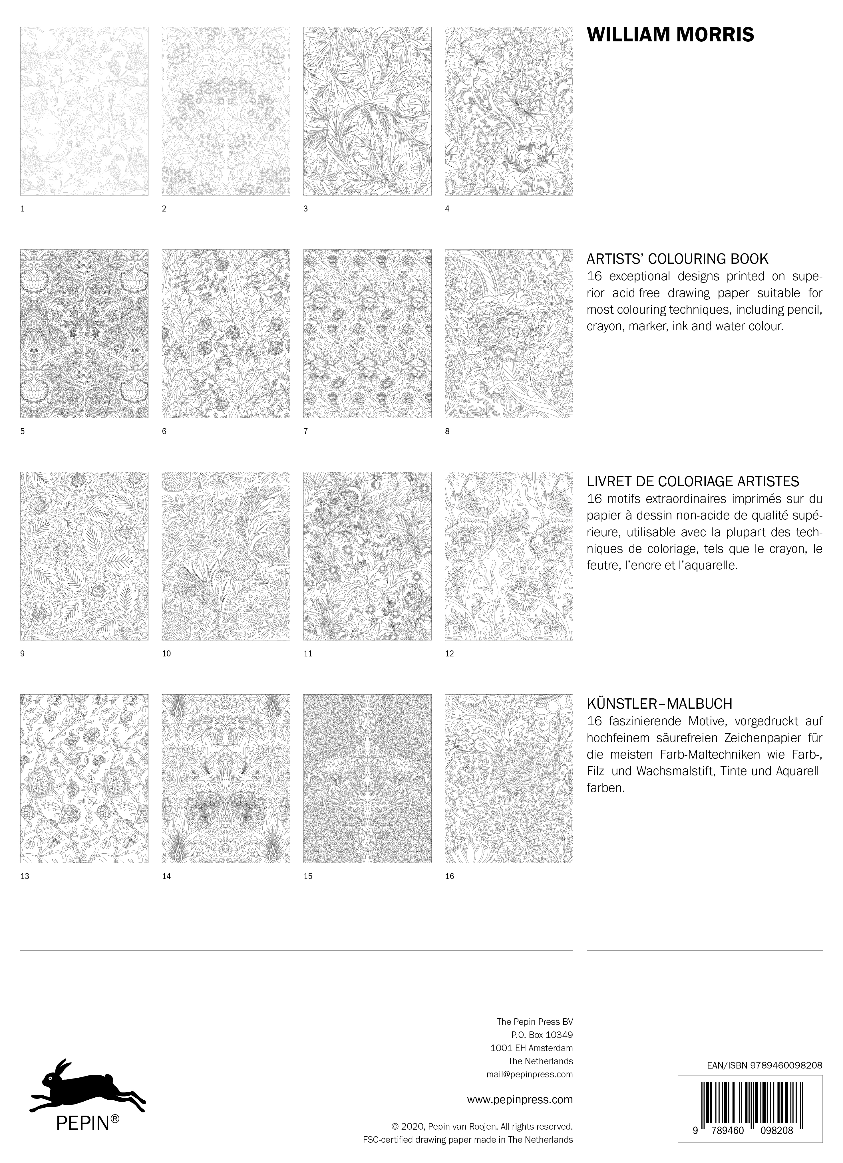 PEPIN Artists' Colouring Books contain 16 sheets (25x34.5cm) of superior acid-free 180 gsm drawing paper, printed with exceptional designs in very light lines. The original outline will be hardly visible after colouring. Suitable for a wide range of colouring appl.,incl. pencil, crayon, pastel, felt marker, gouache, water colours and liquid inks.