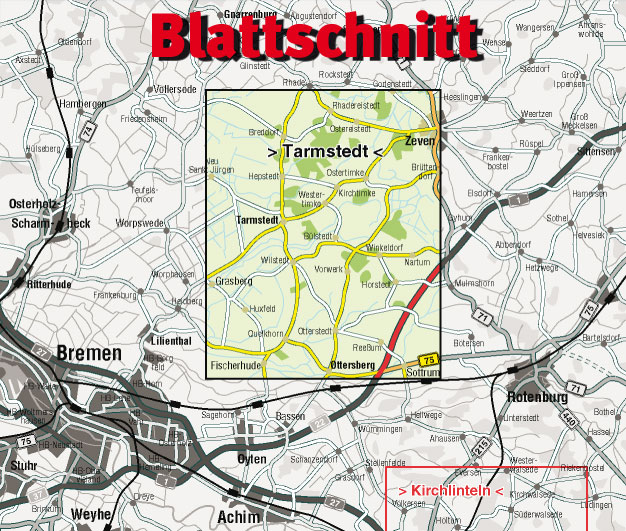 - großräumiger Blattschnitt im Maßstab 1:25.000 (im Norden mit Bademühlen, im Süden bis zur Wümme mit Fischerhude, Ottersberg und Stuckenborstel)