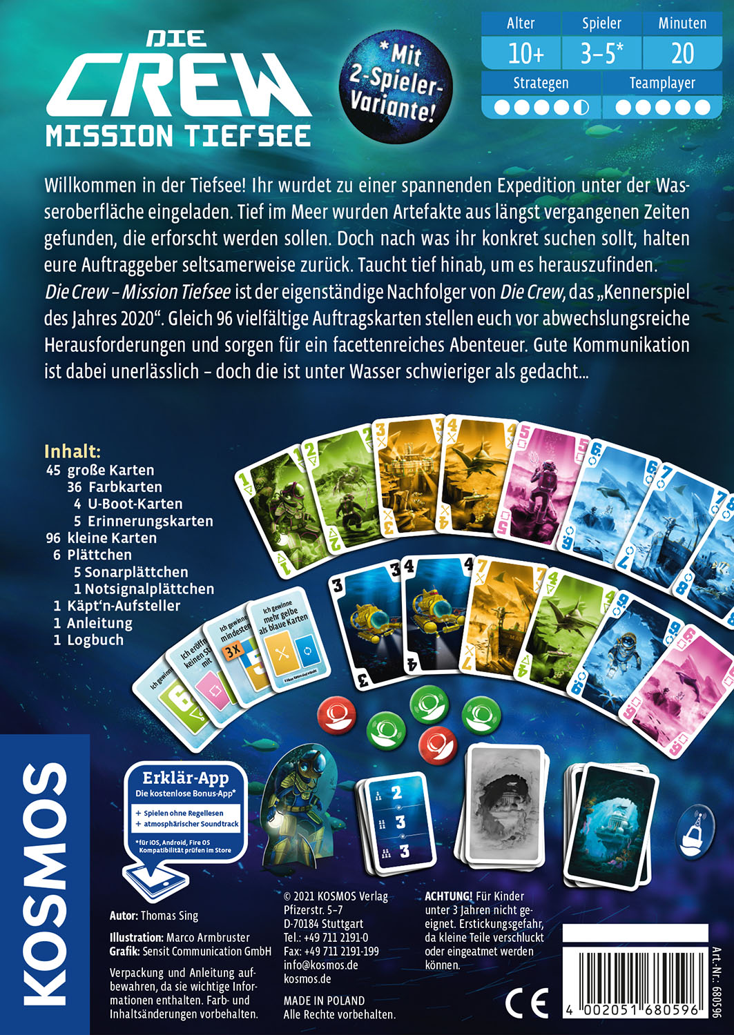 Der Nachfolger vom Kennerspiel des Jahres 2020. Kartenspiel unabhängig vom ersten Titel der Reihe spielbar. Mit besonderer Spielvariante für 2 Spieler. Spannende Herausforderung: Kommunikation im Team ist in der Unterwasser-Welt nur eingeschränkt möglich.Cooler Spieleabend: Kooperatives Kartenspiel für 3-5 Spieler ab 10 Jahren. Auf in unglaubliche Unterwasser-Abenteuer! Dieses kooperative Kartenspiel führt die Spieler auf Expedition in die dunklen Tiefen des Meeres. Was wird sie dort erwarten? Nur im Team wird diese Mission ins Unbekannte gelingen. Karte für Karte erfahren die Spieler, welche Herausforderungen auf sie warten. Wenn keine Fehler passieren und jeder seine Aufgabe richtig erfüllt, gelangen sie alle gemeinsam ans Ziel. Kommunikation zwischen den Spielern ist das A und O bei diesem Kartenspiel - doch das ist unter Wasser gar nicht so einfach!