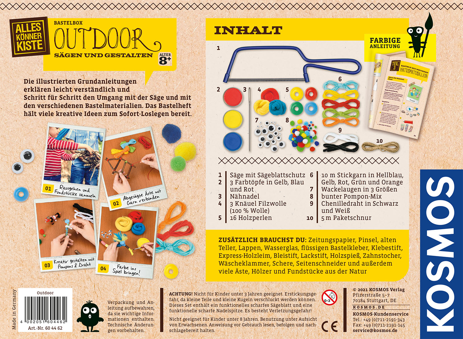 Stark! Mit der AllesKönnerKiste "Outdoor" sammeln und verarbeiten Kinder ab 8 Jahren verschiedenen Naturmaterialien. Praktisch: Die handliche und kindgerechte Säge hilft beim zerkleinern der Äste und ist mit einem Sägeblattschutz ideal für unterwegs. Kreativ-Projekt für Naturliebhaber: Fördert das genaue Arbeiten mit unterschiedlichen Materialien und der bunten Materialsammlung. Ausführliche Schritt-für-Schritt-Anleitung: charmante Monster-Illustrationen führen durch die reich bebilderte Anleitung im Anleitungsheft und online auf kosmos.de. Gewusst wie: Hintergrund-Facts und zum Thema Bäume und Hölzer schaffen Lust auf eigene DIY-Projekte. Freude am Basteln: Schult Kreativität, Feinmotorik und sensibilisiert den Umgang mit der Natur. Hochwertiges Material: Kindgerechte Säge mit Sägeblattschutz und eine umfangreiche bunte Bastelmaterialmischung. Das ideale DIY-Geschenk-Set: Die AllesKönnerKisten enthalten alle Materialien, um sofort loszulegen. Ideal für Kindergeburtstag, Einschulung, Weihnachten oder gemeinsame Bastelnachmittage. Suchen, sammeln, sägen! Äste, Blätter, Blüten, Steine - jede Menge wunderschöner Schätze finden sich draußen in der Natur. Schritt für Schritt entstehen mit dieser AllesKönnerKiste einzigartige und kreative Traumfänger, bunte Mobiles, verrückte Waldgeister, Steintiere, Naturpinsel und vieles mehr. Die ausführlich bebilderte Anleitung erklärt Kindern ab 8 Jahren den fachgerechten Umgang mit der handlichen Säge und liefert wertvolle Tipps für den Umgang mit Filzwolle, Pompons, Farbe, Chenilledraht und weiteren Bastelutensilien, sodass das eigene DIY-Bastelprojekt mit Naturmaterialien garantiert gelingt. Worauf noch warten? Das Abenteuer Natur ruft!