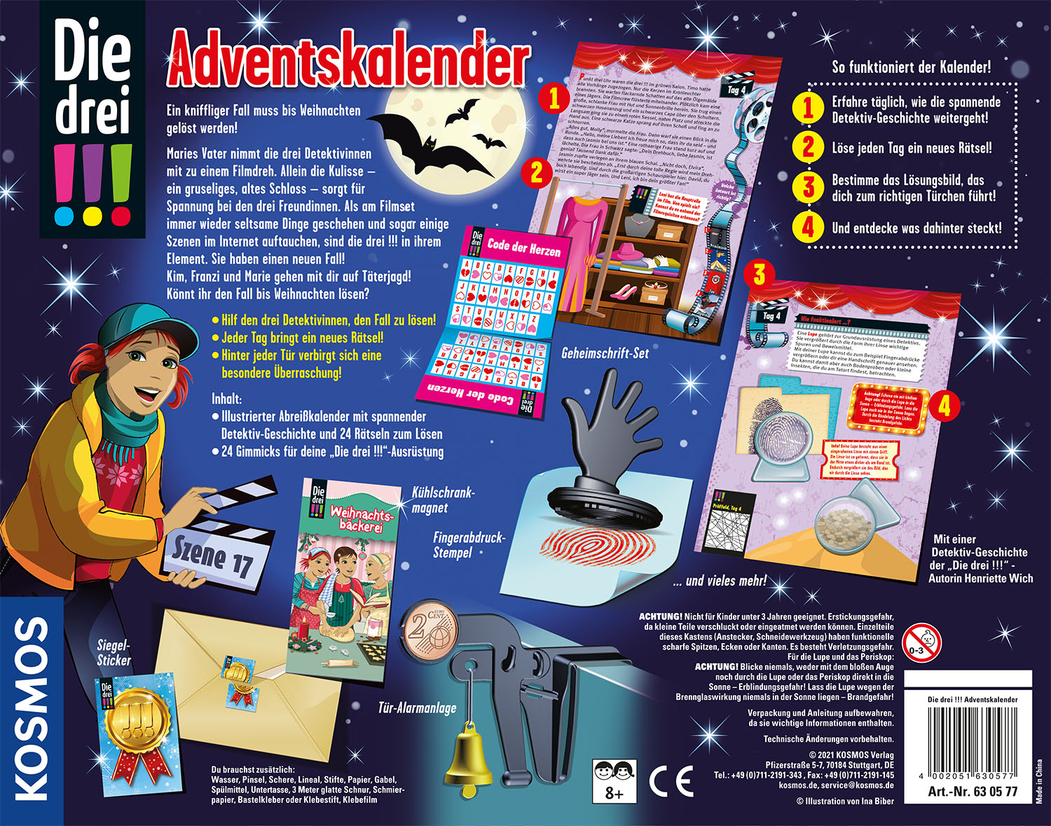 Adventskalender 2021 mit spannender Detektiv-Geschichte zum KnobelnBesondere Mechanik: Jeden Tag muss ein Rätsel in der Geschichte gelöst werden, um das nächste Türchen zu findenDie drei !!! ermitteln hinter den Kulissen beim FilmTolle Detektiv-Gadgets zum SammelnSuper Geschenk für Hobbydetektive ab 8 JahrenAufregung am Filmset! Die drei !!! schauen hinter die Kulissen und geraten dabei in einen spannenden Fall - und ihnen bleiben nur 24 Tage, um ihn zu lösen. Zum Glück werden die Detektivinnen bei ihrer Spurensuche von Kindern ab 8 Jahren unterstützt! Wie das geht? Um das nächste Türchen im Adventskalender zu finden, lesen sie die fesselnde Detektivgeschichte und lösen täglich ein kniffliges Rätsel. Das verborgene Lösungsbild zeigt den Ermittlern, wo es am nächsten Tag weitergeht. Zur Belohnung wartet hinter jedem Türchen ein cooles Gimmick. So vergeht die Zeit bis Weihnachten im Flug!