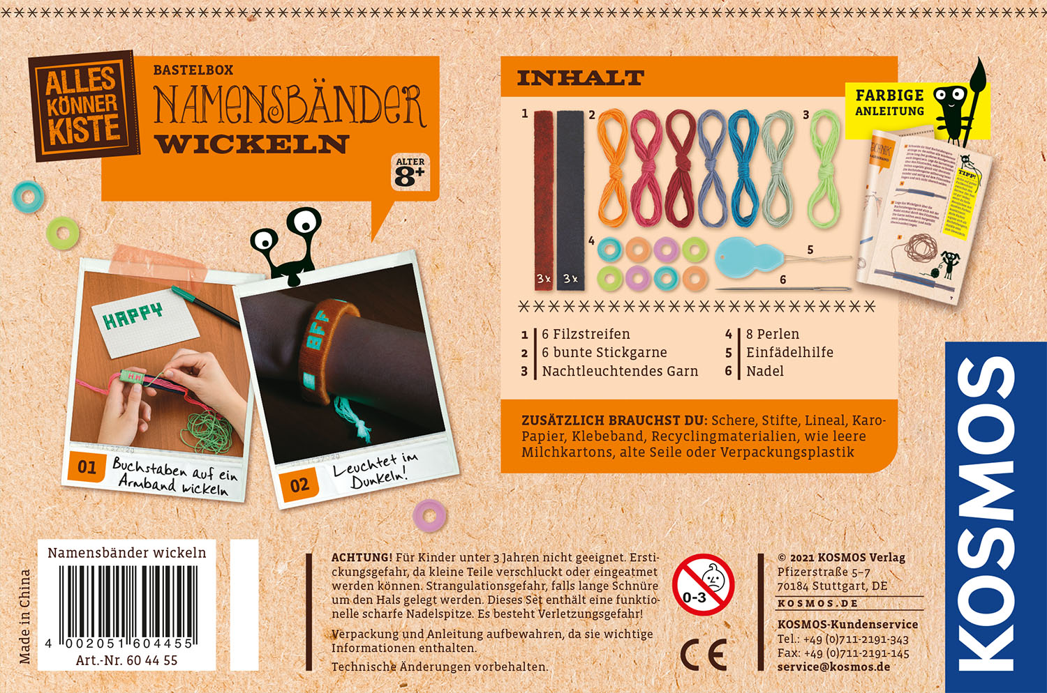 Cool! Mit der AllesKönnerKiste "Namensbänder wickeln" entwerfen Kinder ab 8 Jahren ganz individuelle Armbänder in lässigen Designs. Angesagt: viele bunte Garne und ein nachleuchtender Garn sorgen für einen besonderen Effekt. Ausführliche Schritt-für-Schritt-Anleitung: mit tollen Tipps, wie bspw. zusätzlichen Ideen mit Recyclingmaterialien. Kreativ-Projekt für Einsteiger: Arbeiten mit buntem Filz und farbigem Garn. Freude am Basteln: Kreativität, Feinmotorik und Gestaltung werden trainiert. Hochwertiges Material: Filzstreifen, Stickgarne, Perlen, Einfädelhilfe, Nadel. Das ideale DIY-Geschenk-Set: Die AllesKönnerKisten enthalten alle Materialien, um sofort loszulegen. Ideal als kleines Geschenk zum Geburtstag, Einschulung, Weihnachten oder gemeinsame Bastelnachmittage! Jetzt wird gewickelt! Mit dieser AllesKönnerKiste zaubern Kinder ab 8 Jahren lustige Botschaften, Muster und die Namen ihrer Freunde auf bunte Armbänder. Die Anleitung erklärt ausführlich die besondere Wickeltechnik und liefert viele Beispiele für das individuelle Accessoire. Dafür die gewünschten Baumwollgarne und Perlen in den Lieblingsfarben auswählen und losbasteln. Bei diesem DIY-Projekt sind der Kreativität keine Grenzen gesetzt! Besonders cool: auch neon- und nachtleuchtende Garne sind in diesem Bastelset enthalten und machen dein Kunstwerk zum echten Hingucker. Jetzt heißt es: An die Wolle, fertig, los!
