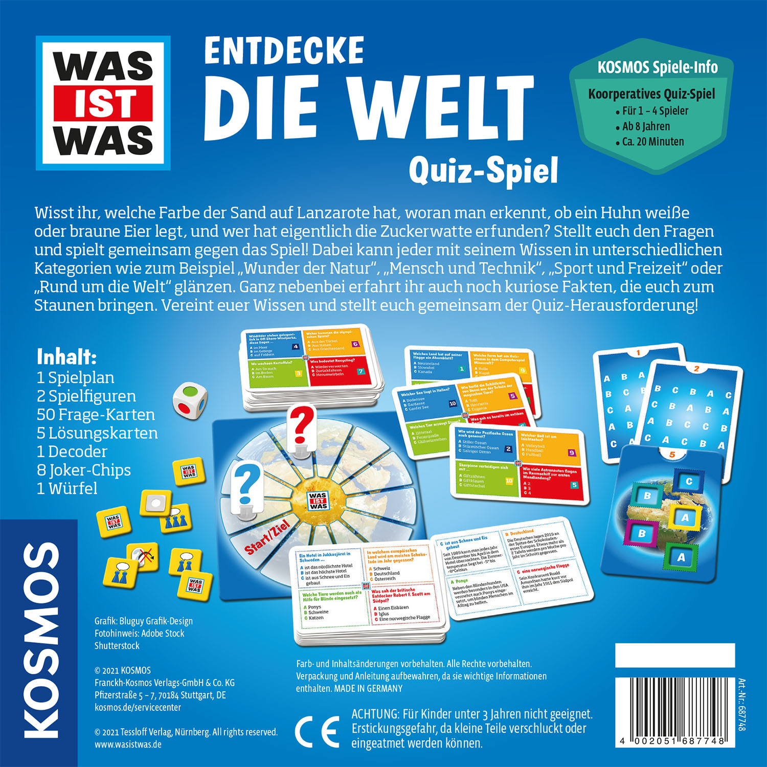 Wie sieht der Sand auf Lanzarote aus? Wer hat Zuckerwatte erfunden? Diesen und unzähligen weiteren Fragen aus fünf Kategorien gehen Kinder ab 8 Jahren gemeinsam im kooperativen Brettspiel nach. Tiere und Pflanzen, Geschichte, Technik, Wissenschaft und kluge Köpfe: der Würfel entscheidet, welcher Themenbereich zuerst drankommt. Frage richtig beantwortet? Die Decodierkarte hilft, die passenden Lösungen und Infos zu finden. Die Spielfigur darf weiterwandern. Und wenn die Frage doch zu schwierig ist? Dann helfen unterschiedliche Joker-Chips. Ein tolles Quiz und Familienspiel mit Lerneffekt für Groß und Klein! Das ideale Geburtstagsgeschenk.