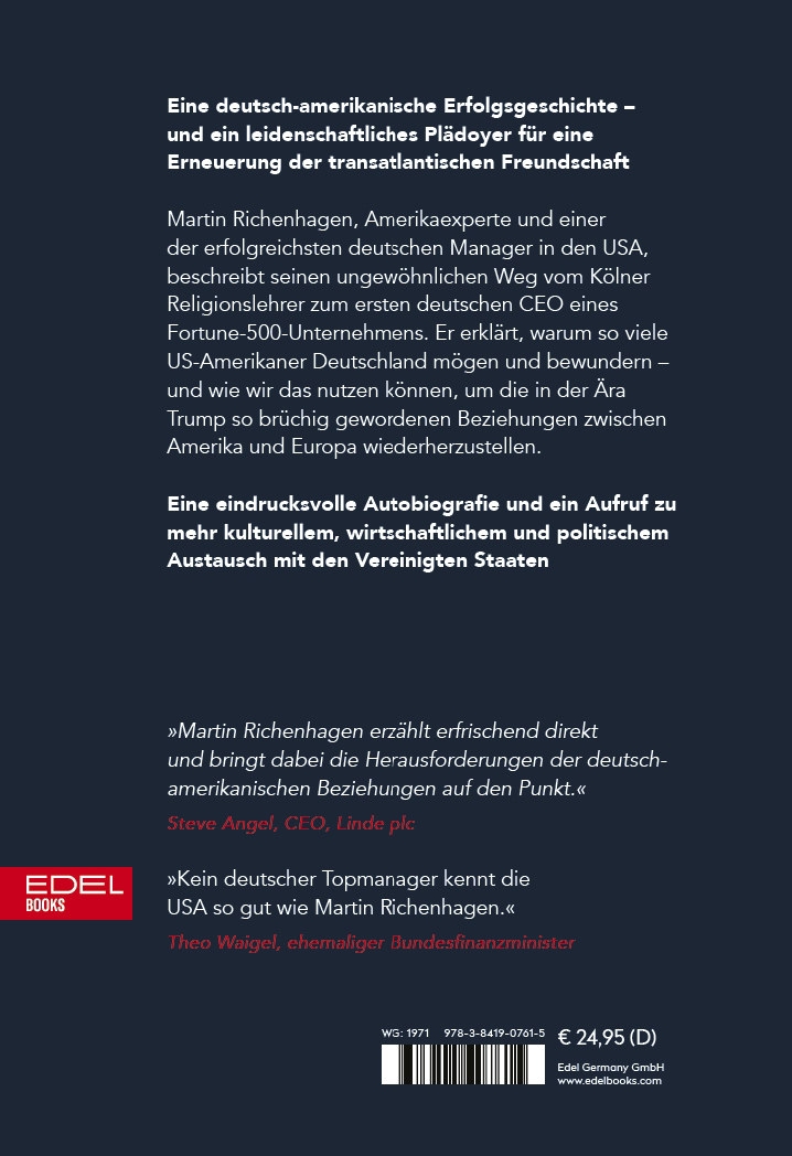 Der Kölner Martin Richenhagen gilt als der erfolgreichste deutsche Manager in den USA. Der Agrar-Experte führte mehrere Großunternehmen, beriet zudem jahrelang die Präsidenten Obama und Trump, von dem er sich allerdings schnell distanzierte. Seine Geschichte klingt wie der American Dream schlechthin: eigentlich Religionslehrer, kam Richenhagen über seine Leidenschaft zum Reitsport mehr zufällig zu einem Job in der Industrie, wo er sich bis zum CEO hocharbeitete. In seinem Buch zeichnet er seinen spannenden Weg aus Deutschland in die amerikanischen Chefetagen und ins Weiße Haus nach, plädiert dabei leidenschaftlich für die Vereinigten Staaten als einen wichtigen Partner der Zukunft. Er erklärt, warum so viele US-Amerikaner Deutschland mögen und bewundern - und wie wir das nutzen können, um die durch Trump und Corona brüchig gewordene Beziehung wiederherzustellen. Eine spannende Biografie und zugleich ein Plädoyer für mehr kulturellen, wirtschaftlichen und politischen Austausch.