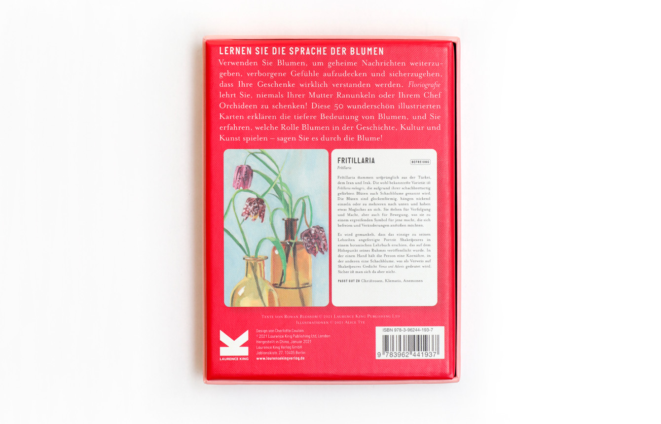 Schenken Sie Ihrer Mutter niemals einen Hahnenfuß oder gar Ihrem Chef Orchideen! Denn Blumen können 'sprechen'! Von der Orangenblüte für die Unschuld bis hin zu gelben Rosen für die Untreue - seit Jahrhunderten werden Blüten und Blumen mit bestimmten Botschaften verbunden, die man kennen sollte, will man keinen Fehler machen. Die wundervoll illustrierten Karten unseres neuen Natur-Sets Floriografie setzen Sie ins Bild und bewahren Sie vor einem möglichen Faux-pas. Neben ihrer emotionalen und gesellschaftlichen Bedeutung erforschen die 50 zeichnerischen Präsentationen der Gewächse auch die grundsätzliche Bedeutung von Blüten in Geschichte, Popkultur und Kunst. Am Ende können auch Sie Ihre Botschaft souverän 'durch die Blume' sagen.