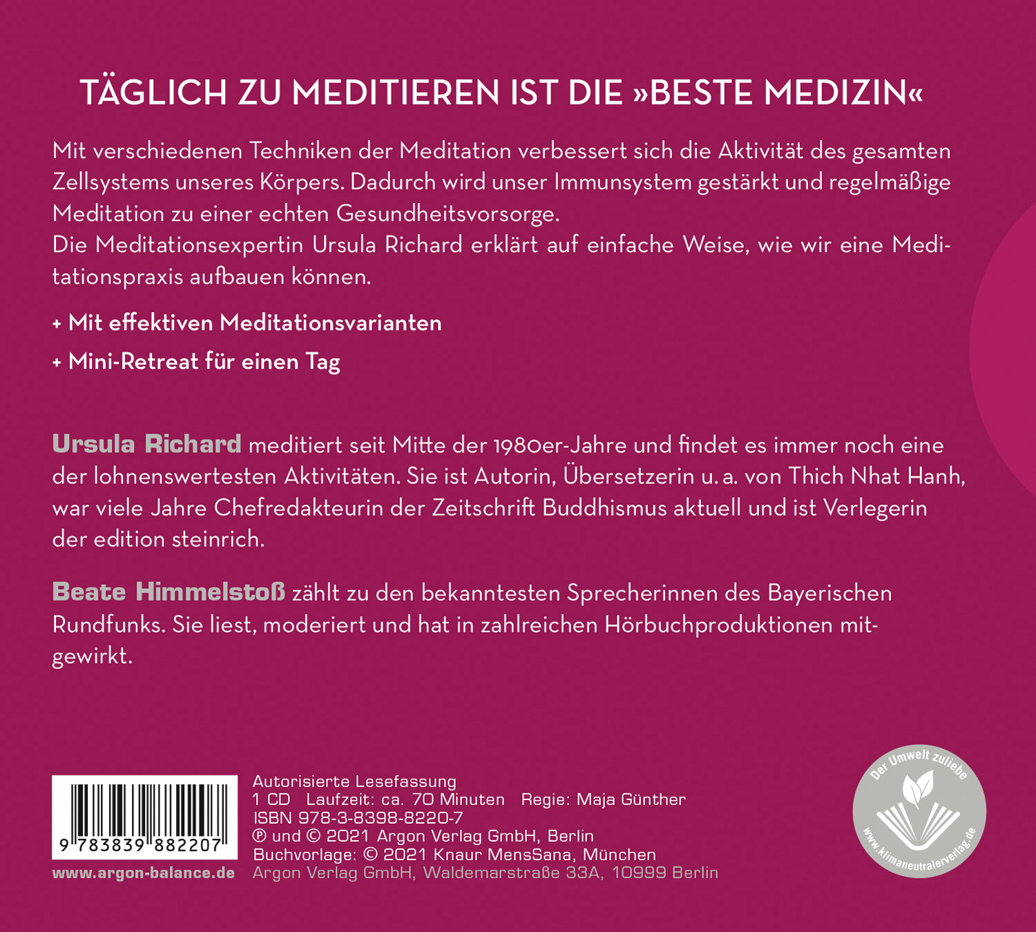 Mit verschiedenen Techniken der Meditation verbessert sich die Aktivität des zentralen Nervensystems. Dadurch wird unser Immunsystem hochgefahren und regelmäßige Meditation zu einer echten »Krankenversicherung«. Die Meditationsexpertin Ursula Richard gibt einen kurzen Überblick über die faszinierenden Ergebnisse der Wissenschaft und führt in die wichtigsten Formen der Meditation ein. Den Abschluss bildet ein Achtsamkeitstag, den jeder als Mini-Retreat einmal mit sich ganz allein verbringen kann. Eine praktische und informative Kompaktanleitung zum selbstständigen Meditieren.