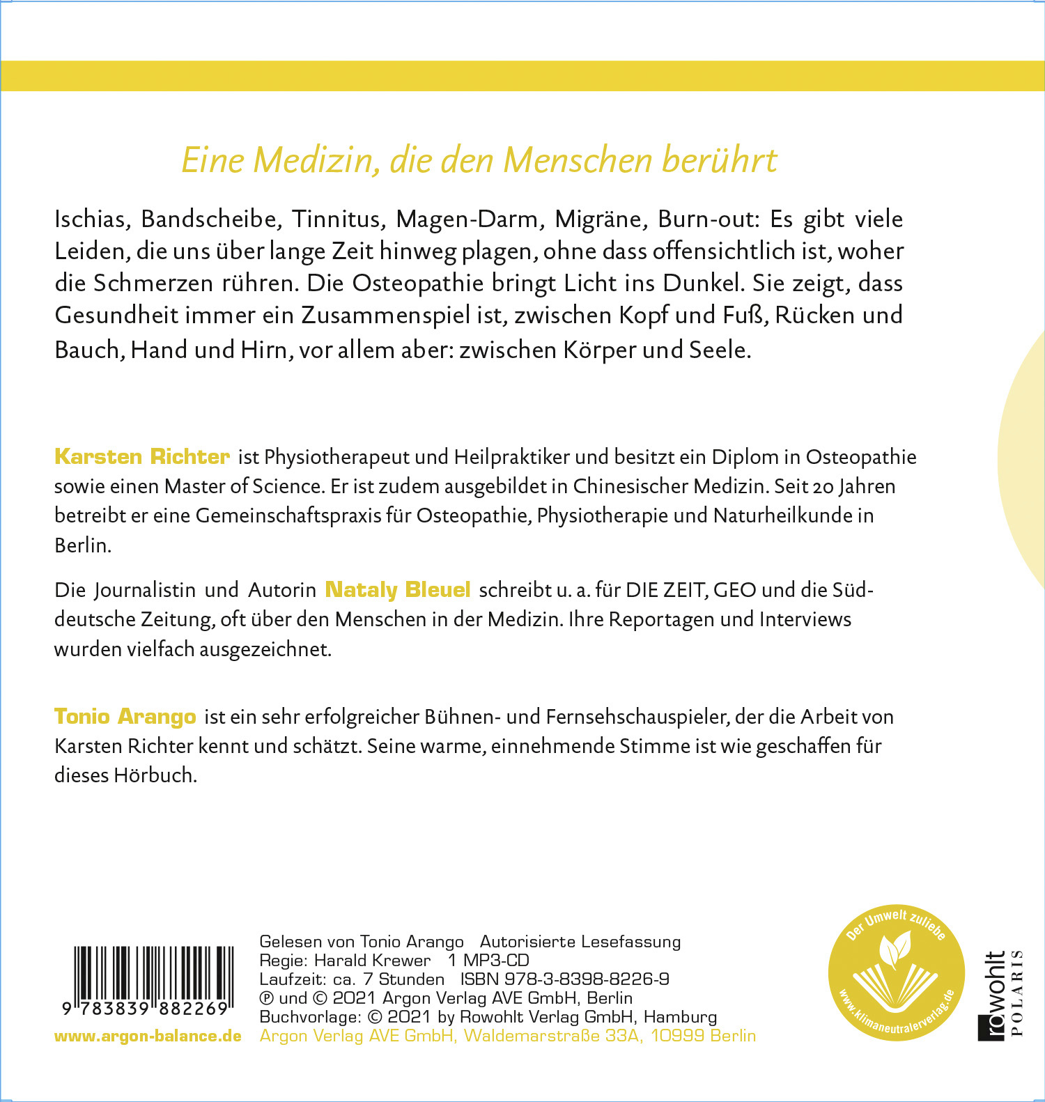 Karsten Richter arbeitet seit vielen Jahren als Osteopath und Dozent. In seiner Praxis hat er Tausende Menschen untersucht und behandelt. Er kennt nicht nur ihre Leiden - Rückenschmerzen, Knieprobleme, Migräne, Tinnitus, hormonelle Verstimmungen, Magen-Darm-Probleme, Burnout -, sondern auch ihre Fragen: Warum behandeln Sie statt des steifen Nackens meinen Bauch? Warum meinen Blinddarm, wenn der Miniskus schmerzt? Karsten Richter behandelt mit den Händen nicht nur die Symptome eines körperlichen Leidens, sondern auch dessen Ursache. Sein Hörbuch ist eine Reise durch den Körper, an deren Ende wir besser verstehen, wie er funktioniert und warum die Osteopathie dringend nötig ist: für eine Komplementärmedizin, die den ganzen Menschen berührt.