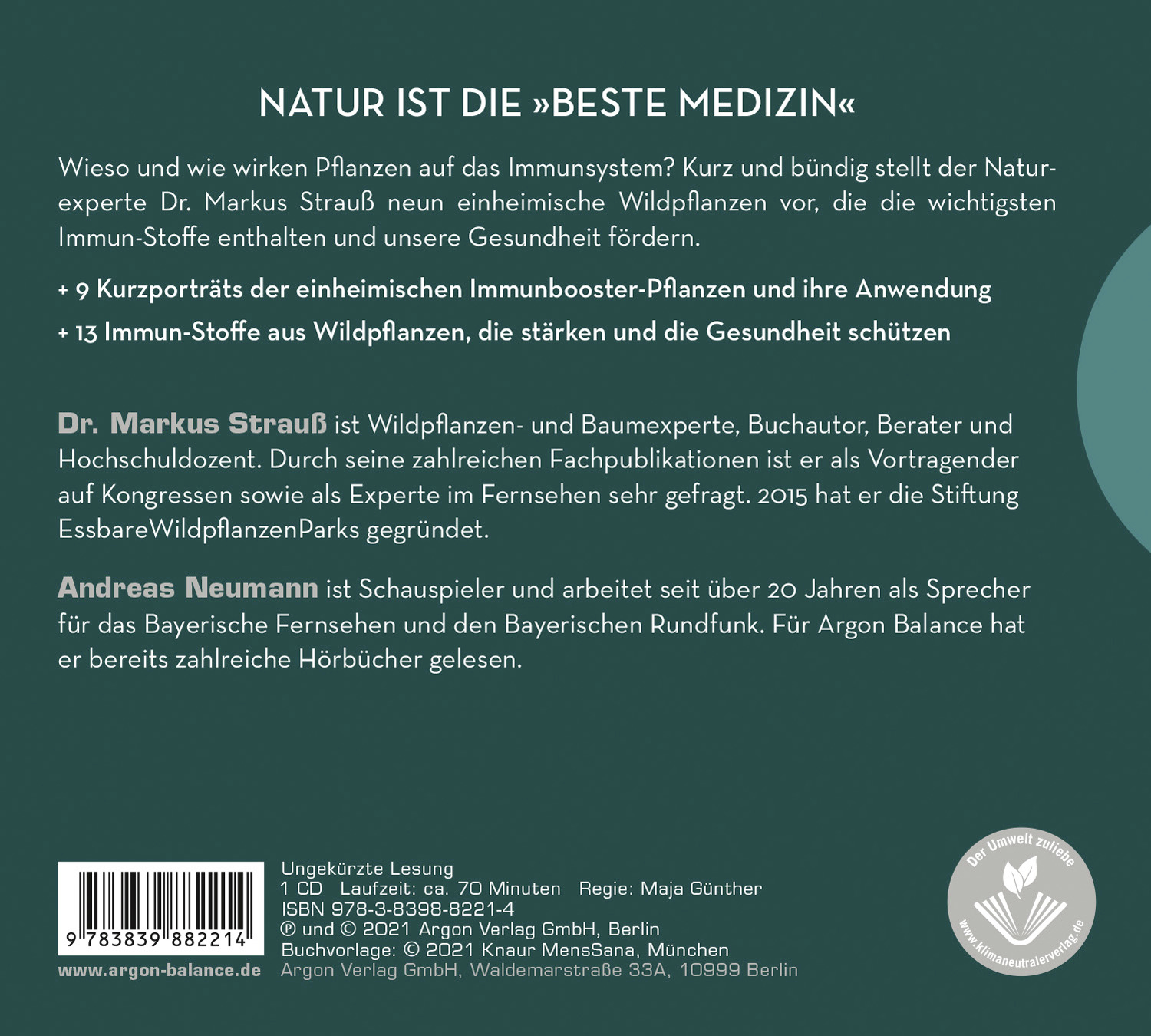 Wie wirken Pflanzen auf das Immunsystem? In diesem Einführungsratgeber stellt der Naturexperte Dr. Markus neun einheimische Wildpflanzen vor, die wichtige Immunstoffe enthalten, die unserer Gesundheit besonders zuträglich sind. Pflanzen produzieren Immunstoffe zu ihrem eigenen Schutz, die auch der Mensch gut gebrauchen kann. Besonders essbare Wildpflanzen enthalten viele unterschiedliche Stoffe, auf die unser Immunsystem angewiesen ist. Ein praktisches Natur-Heilbuch inklusive Rezepten aus neun essbaren und schmackhaften Wildpflanzen zur Versorgung mit allen Immunstoffen.