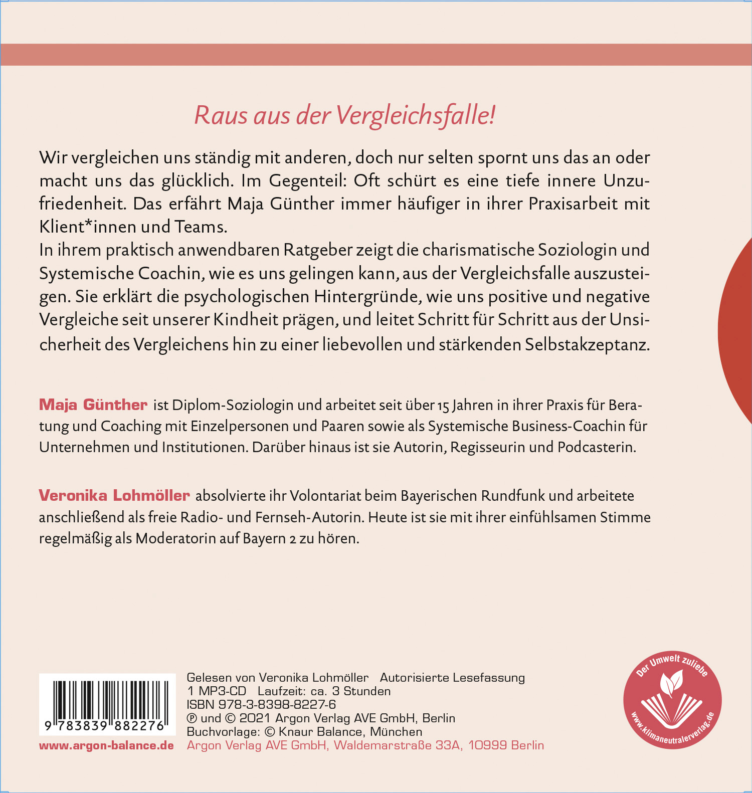 Wir vergleichen uns ständig: Andere sehen besser aus, machen Dinge geschickter als wir und haben einfach viel mehr vom Leben. Maja Günther kennt aus ihrer Beratungspraxis viele solcher Fälle, und durch die sozialen Medien werden es zunehmend mehr. Deshalb hat die charismatische Soziologin ein alltagsnahes Coaching entwickelt, das uns hilft, aus der Vergleichsfalle auszusteigen. In ihrem Hörbuch erklärt sie die psychologischen Hintergründe für unsere mangelnde Selbstliebe, die uns seit unserer Kindheit prägen, und begleitet uns Schritt für Schritt aus der Unsicherheit des Vergleichens hin zu einer authentischen Selbstakzeptanz.