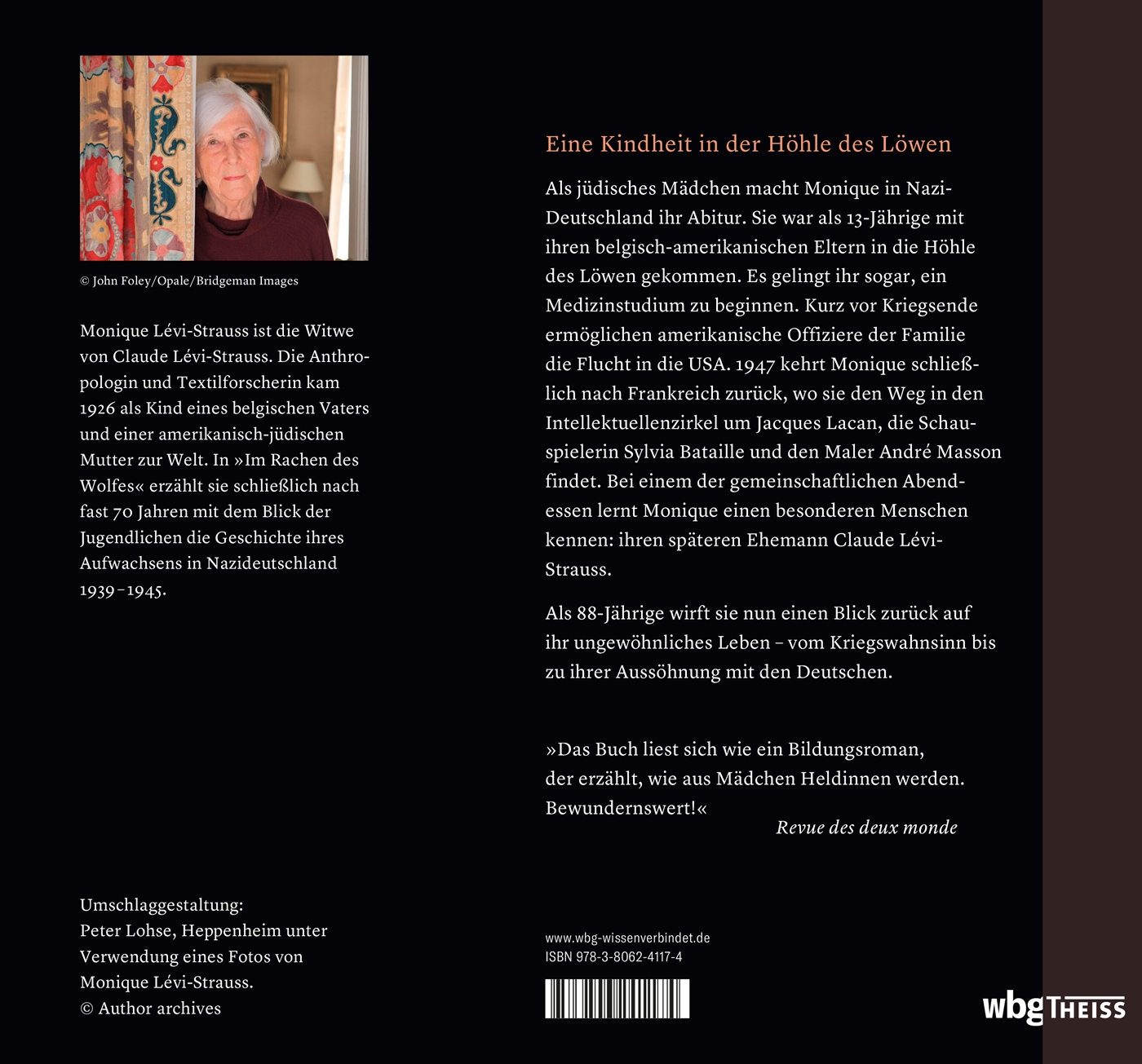Monique Lévi-Strauss, geboren 1926 als Monique Roman, ist die Witwe von Claude Lévi-Strauss (1908—2009), Altmeister der Ethnologie und Ikone der Soziologen und Philosophen. Die Anthropologin und Textilforscherin kam als Kind eines belgischen Vaters und einer amerikanisch-jüdischen Mutter zur Welt. In »Im Rachen des Wolfes« erzählt sie schließlich nach fast 70 Jahren mit dem Blick der Jugendlichen die Geschichte ihres Aufwachsens in Nazideutschland 1939—1945.