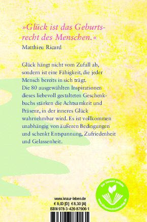 Die 80 inspirierenden buddhistischen Texte dieses liebevoll illustrierten TB-Geschenkbuchs sind dem 2007 erschienenen Besteller "Glück" von Matthieu Ricard entnommen. Sie stärken die Achtsamkeit und Präsenz, in der dieses innere Glück wahrnehmbar wird, und sie weisen auch auf die Hindernisse, die uns im Weg stehen.