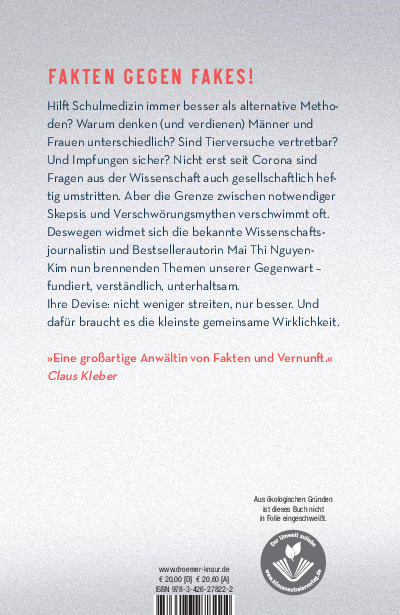 Bestechend klarsichtig, wunderbar unaufgeregt und herrlich kurzweilig ermittelt sie anhand wissenschaftlicher Erkenntnisse das, was faktisch niemand in Abrede stellen kann, wenn es beispielsweise um Erblichkeit von Intelligenz, Gender Pay Gap, Klimawandel oder Legalisierung von Drogen geht. Mai Thi Nguyen-Kims Suche nach dem Kern der Wahrheit zeigt dabei nicht nur, was unanfechtbar ist und worauf wir uns alle einigen können. Mehr noch: Sie macht deutlich, wo die Fakten aufhören, wo Zahlen und wissenschaftliche Belege fehlen – wo wir also völlig berechtigt uns gegenseitig persönliche Meinungen an den Kopf werfen dürfen.