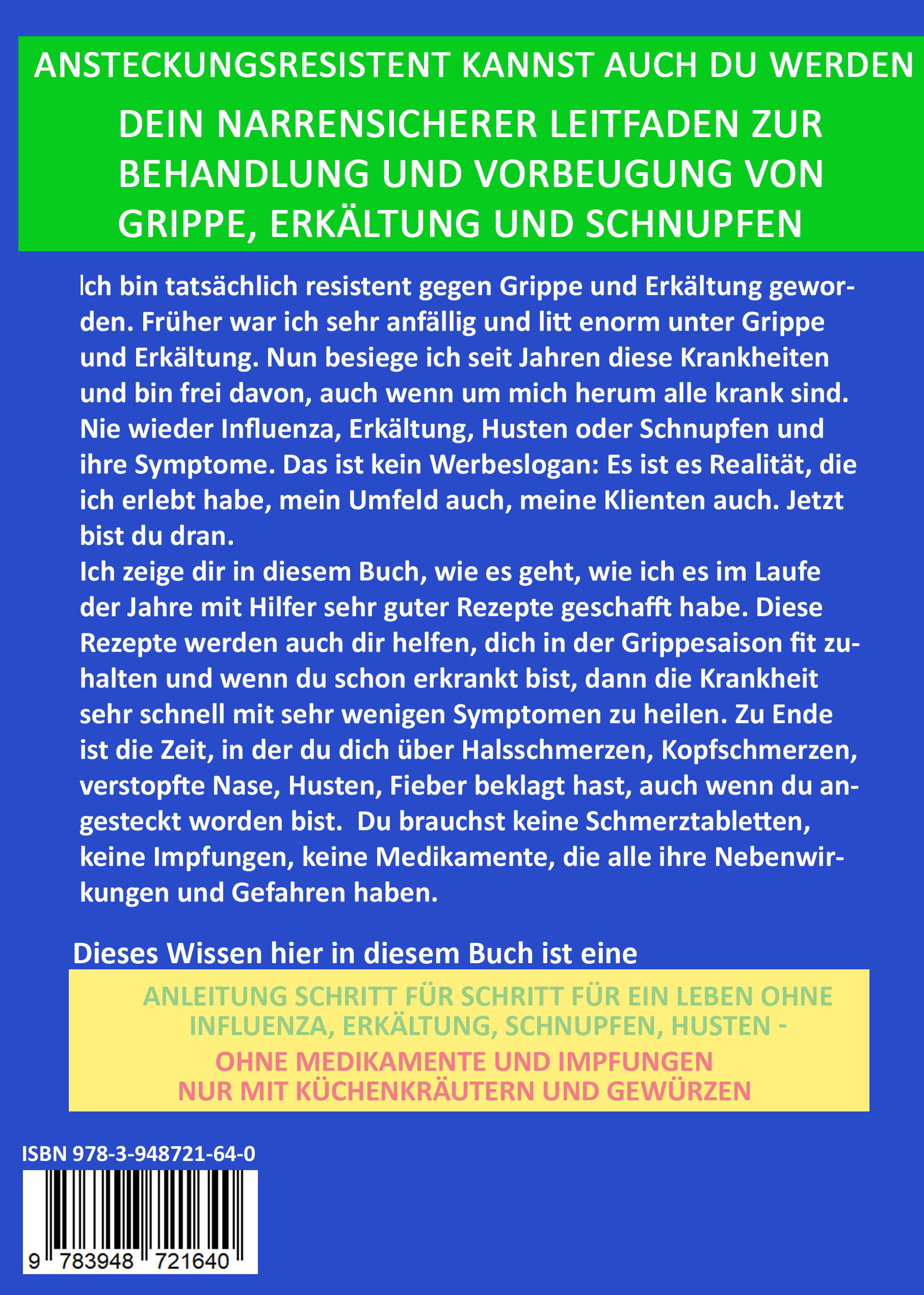 Ich zeige dir in diesem Buch, wie es geht, wie ich es im Laufe der Jahre mit sehr guten Rezepten geschafft habe, gesund zu bleiben. Diese Rezepte halten dich in der Grippesaison fit und wenn du schon erkrankt bist, kannst du die Krankheit sehr schnell mit sehr wenigen Symptomen heilen. Zu Ende ist die Zeit, in der du dich über Halsschmerzen, Kopfschmerzen, verstopfte Nase, Fieber beklagst. Du brauchst keine Schmerztabletten, keine Impfungen, keine Medikamente, die alle ihre Nebenwirkungen und Gefahren haben.