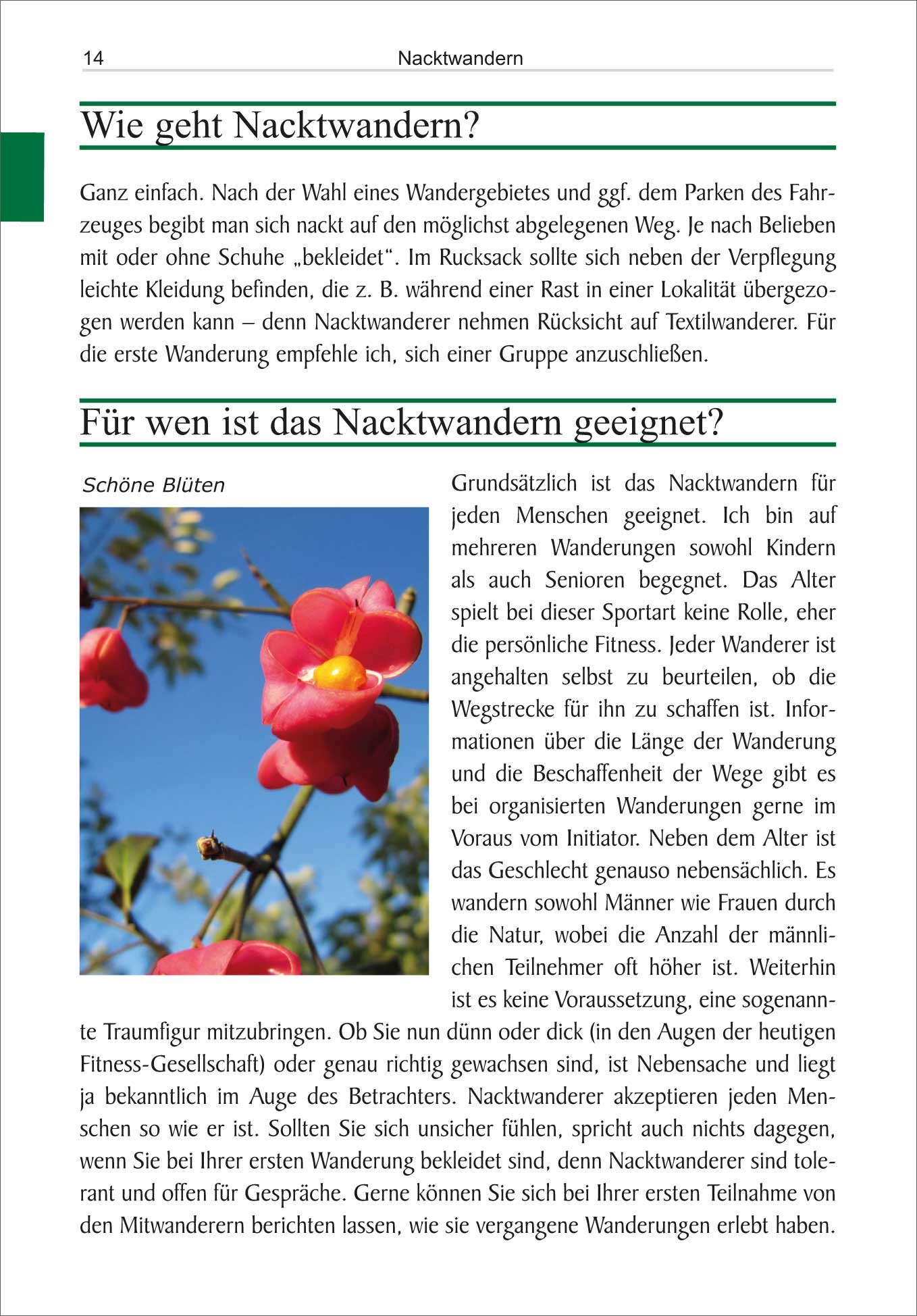 Vorwort, Nacktwandern, Gefahren (nicht nur für Nacktwanderer), Ihre erste Nacktwanderung, Andere Nacktsportarten, Geschichte und Gesetzgebung, Erfahrungen, Erster deutscher Nacktwanderweg, Zweiter deutscher Nacktwanderweg, Anhang.