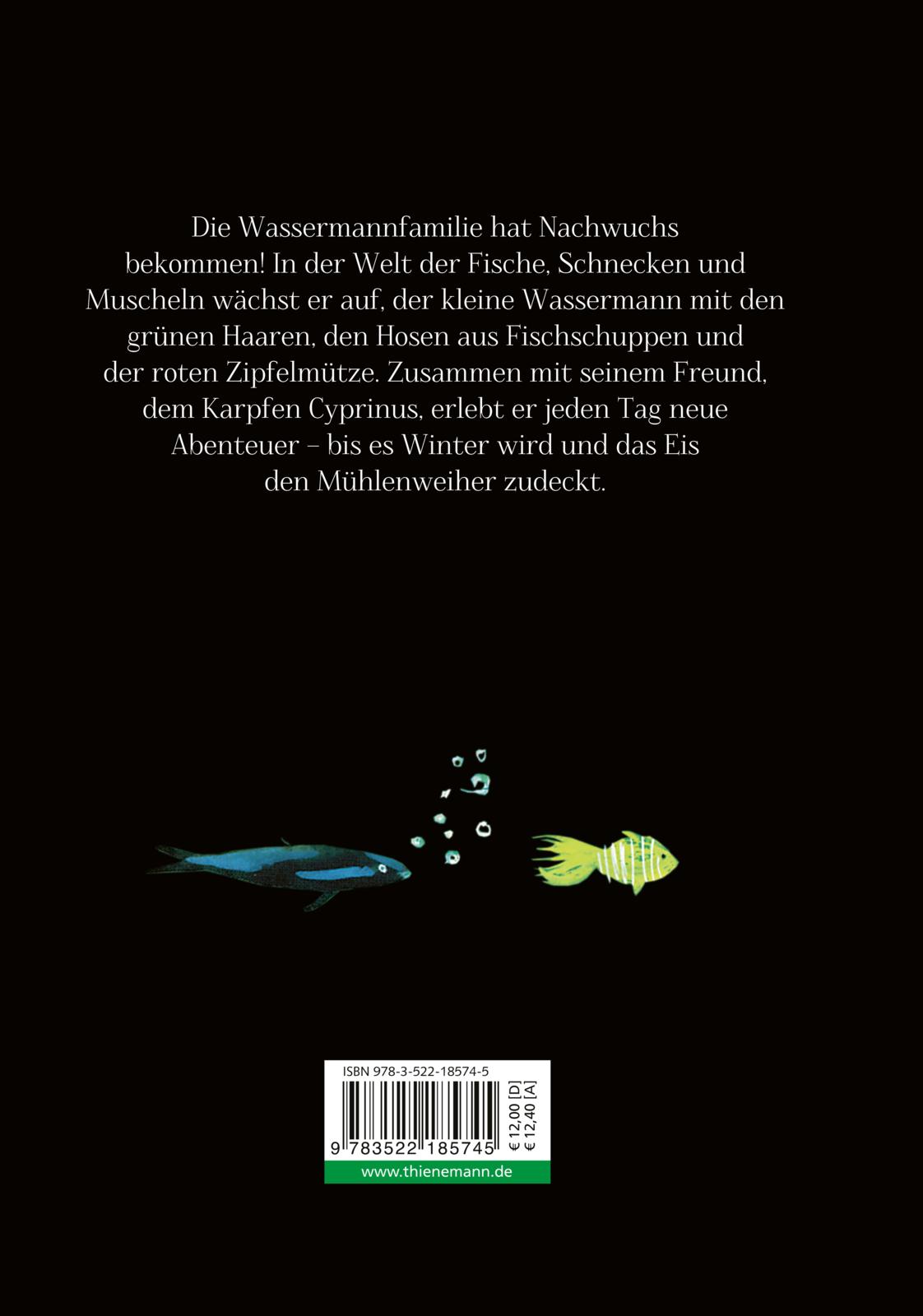 Eines Tages bekommt die Wassermannsfamilie im Mühlenweiher Nachwuchs. Der kleine Wassermann mit grünen Haaren und Schwimmhäuten zwischen den Zehen gedeiht prächtig und findet überall Freunde. Bald geht der kleine Wassermann mit seinem Vater oder mit seinem Freund, dem Karpfen Cyprinus, auf Entdeckungsreise. Er lernt sich im Weiher zurechtzufinden und erlebt tagtäglich neue Abenteuer, bis es Winter wird und das Eis den Mühlenweiher wieder zudeckt.