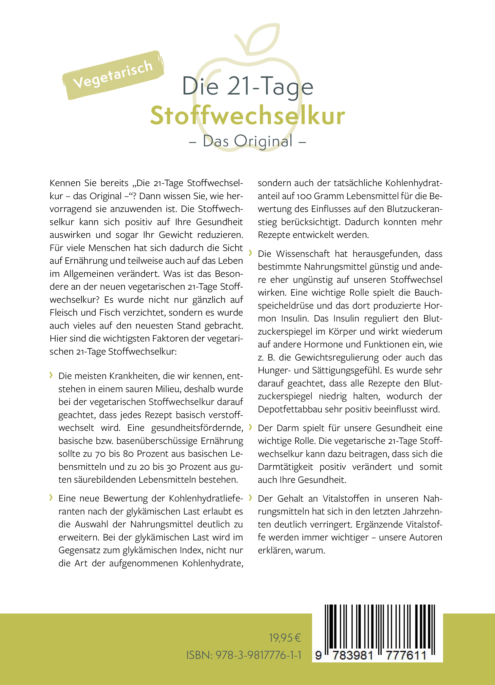 Kennen Sie bereits "Die 21-Tage Stoffwechselkur - das Original"?Dann wissen Sie, wie einfach und effektiv sie anzuwenden ist. Die Stoffwechselkur kann Ihre Gesundheit positiv beeinflussen und sogar zur Gewichtsreduktion beitragen. Für viele Menschen hat sie nicht nur die Sicht auf Ernährung, sondern auch auf das Leben im Allgemeinen verändert.Was ist das Besondere an der neuen vegetarischen 21-Tage Stoffwechselkur?Nicht nur wurde vollständig auf Fleisch und Fisch verzichtet, auch viele Inhalte wurden auf den neuesten Stand gebracht. Hier sind die wichtigsten Faktoren der vegetarischen Variante:Basische Ernährung im Fokus:Die meisten Krankheiten entstehen in einem sauren Milieu. Deshalb wird bei der vegetarischen Stoffwechselkur sichergestellt, dass alle Rezepte basisch verstoffwechselt werden. Eine gesundheitsfördernde Ernährung sollte zu 70-80 % aus basischen und zu 20-30 % aus hochwertigen säurebildenden Lebensmitteln bestehen.Erweiterte Auswahl durch glykämische Last:Die glykämische Last berücksichtigt im Gegensatz zum glykämischen Index nicht nur die Art der Kohlenhydrate, sondern auch deren tatsächlichen Anteil auf 100 g Lebensmittel. Dadurch konnte die Auswahl der Nahrungsmittel erheblich erweitert und mehr Rezepte entwickelt werden.Positive Wirkung auf den Stoffwechsel:Die Wissenschaft zeigt, dass bestimmte Lebensmittel den Stoffwechsel fördern, während andere ihn hemmen. Die Bauchspeicheldrüse und das Hormon Insulin spielen dabei eine Schlüsselrolle. Insulin reguliert den Blutzuckerspiegel und beeinflusst wichtige Funktionen wie die Gewichtsregulation sowie das Hunger- und Sättigungsgefühl. Alle Rezepte wurden so gestaltet, dass sie den Blutzuckerspiegel stabil halten und den Depotfettabbau fördern.Unterstützung für den Darm:Ein gesunder Darm ist essenziell für das Wohlbefinden. Die vegetarische 21-Tage Stoffwechselkur kann die Darmtätigkeit positiv beeinflussen und so zu einer besseren Gesundheit beitragen.Wichtige Vitalstoffe:Der Gehalt an Vitalstoffen in unseren Lebensmitteln hat in den letzten Jahrzehnten stark abgenommen. Ergänzende Vitalstoffe werden daher immer wichtiger - unsere Autoren erklären, warum und wie diese optimal integriert werden können.Die neue vegetarische 21-Tage Stoffwechselkur - Ihr idealer Begleiter für Gesundheit, Wohlbefinden und einen Neustart.