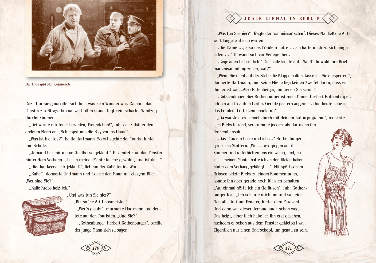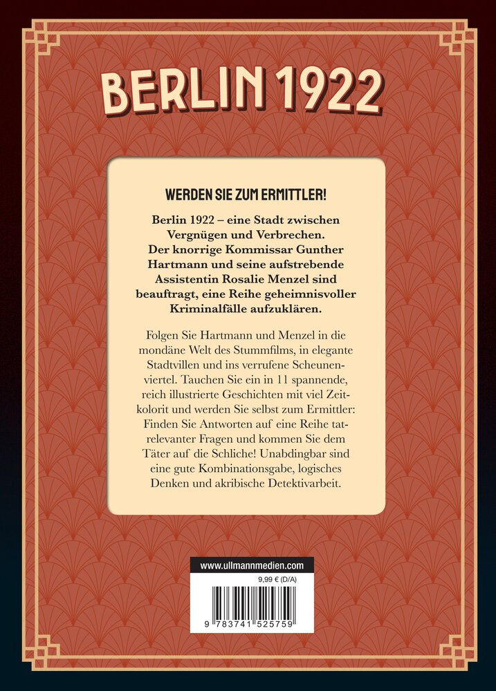 Werden Sie zum Ermittler!Berlin 1922 - eine Stadt zwischen Vergnügen und Verbrechen.Der knorrige Kommissar Gunther Hartmann und seine aufstrebende Assistentin Rosalie Menzel sind beauftragt, eine Reihe geheimnisvoller Kriminalfälle aufzuklären.Folgen Sie Hartmann und Menzel in die mondäne Welt des Stummfilms, in elegante Stadtvillen und ins verrufene Scheunenviertel.Tauchen Sie ein in 11 spannende, reich illustrierte Geschichten mit viel Zeitkolorit und werden Sie selbst zum Ermittler: Finden Sie Antworten auf eine Reihe tatrelevanter Fragen und kommen Sie dem Täter auf die Schliche! Unabdingbar sind eine gute Kombinationsgabe, logisches Denken und akribische Detektivarbeit