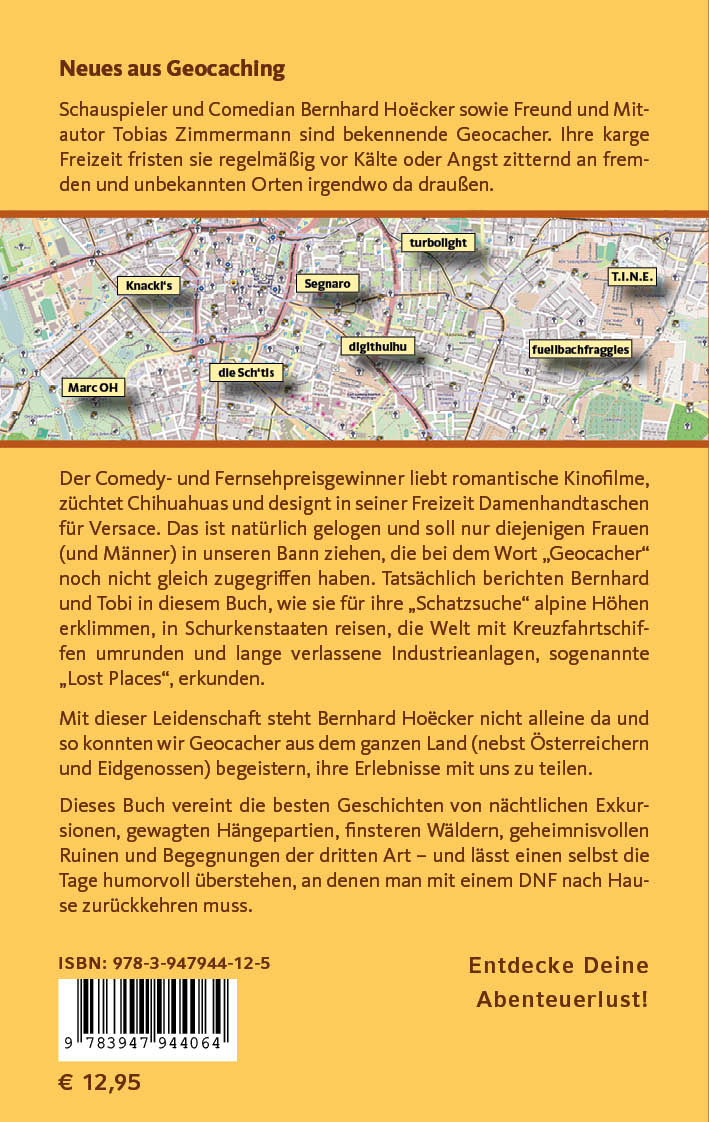 Schauspieler und Comedian Bernhard Hoëcker sowie Freund und Mitautor Tobias Zimmermann sind bekennende Geocacher. Ihre karge Freizeit fristen sie regelmäßig vor Kälte oder Angst zitternd an fremden und unbekannten Orten irgendwo da draußen.Der Comedy- und Fernsehpreisgewinner liebt romantische Kinofilme, züchtet Chihuahuas und designt in seiner Freizeit Damenhandtaschen für Versace. Das ist natürlich gelogen und soll nur diejenigen Frauen (und Männer) in unseren Bann ziehen, die bei dem Wort "Geocacher" noch nicht gleich zugegriffen haben. Tatsächlich berichten Bernhard und Tobi in diesem Buch, wie sie für ihre "Schatzsuche" alpine Höhen erklimmen, in Schurkenstaaten reisen, die Welt mit Kreuzfahrtschiffen umrunden und lange verlassene Industrieanlagen, sogenannte "Lost Places", erkunden. Mit dieser Leidenschaft steht Bernhard Hoëcker nicht alleine da und so konnten wir Geocacher aus dem ganzen Land (nebst Österreichern und Eidgenossen) begeistern, ihre Erlebnisse mit uns zu teilen.Dieses Buch vereint die besten Geschichten von nächtlichen Exkursionen, gewagten Hängepartien, finsteren Wäldern, geheimnisvollen Ruinen und Begegnungen der dritten Art - und lässt einen selbst die Tage humorvoll überstehen, an denen man mit einem DNF nach Hause zurückkehren muss.
